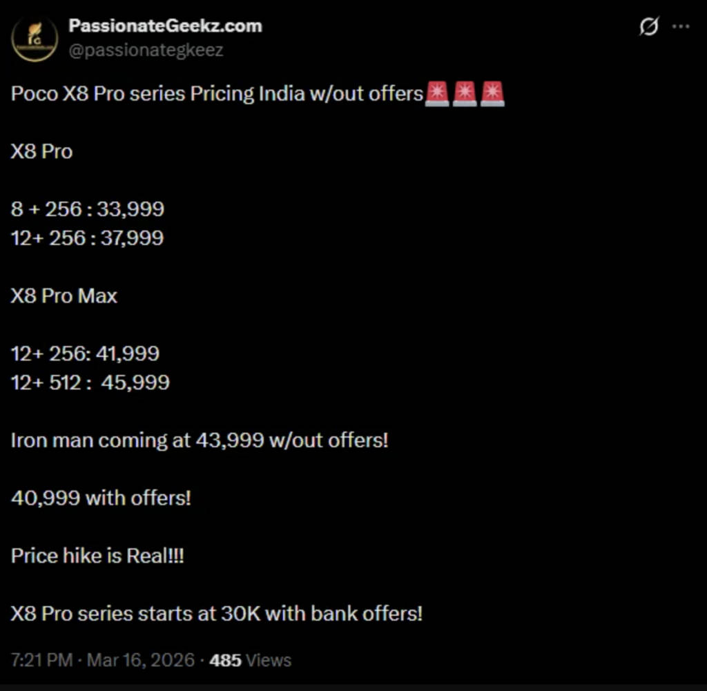 The tipster suggests the POCO X8 Pro will start at Rs 33,999 for the 8GB + 256GB model and Rs 37,999 for the 12GB + 256GB variant. The X8 Pro Max, which doesn’t really have a true predecessor, follows at Rs 41,999 for the 12GB + 256GB model and Rs 45,999 for the 12GB + 512GB variant. The POCO X8 Pro Iron Man Edition could be priced at Rs 43,999 but might drop to Rs 40,999 through launch offers. A Rs 3,000 bank offer could also be offered at launch for all models. Compared to last year’s POCO X7 Pro which started at Rs 26,999, this is a bit of a steep jump. Rising component costs explain it, but POCO would still aim to undercut true flagships while delivering premium features, much like its strategy with all its offerings.