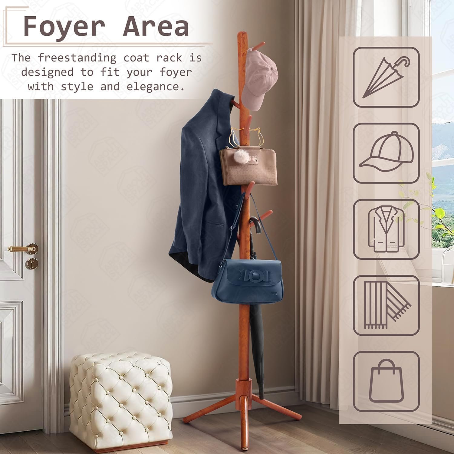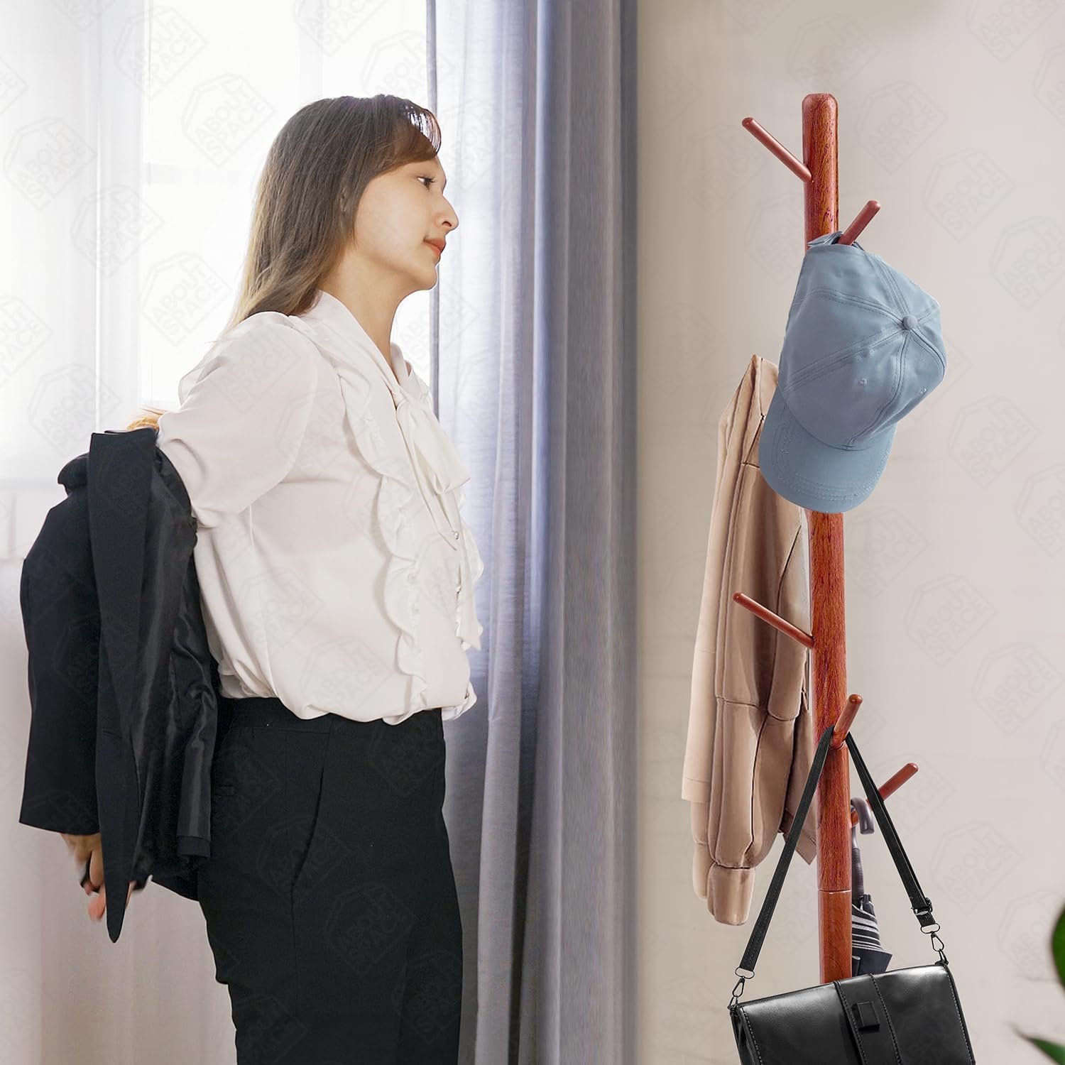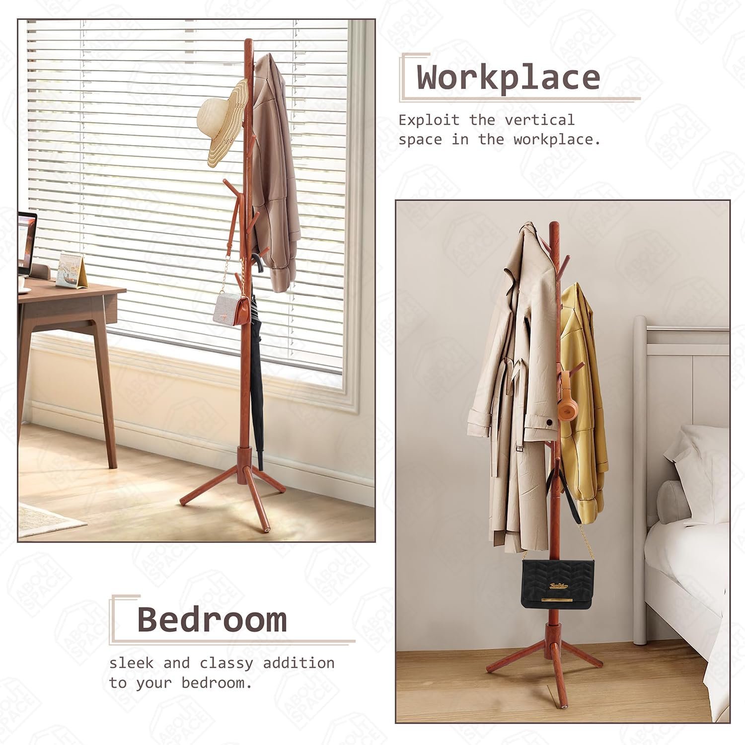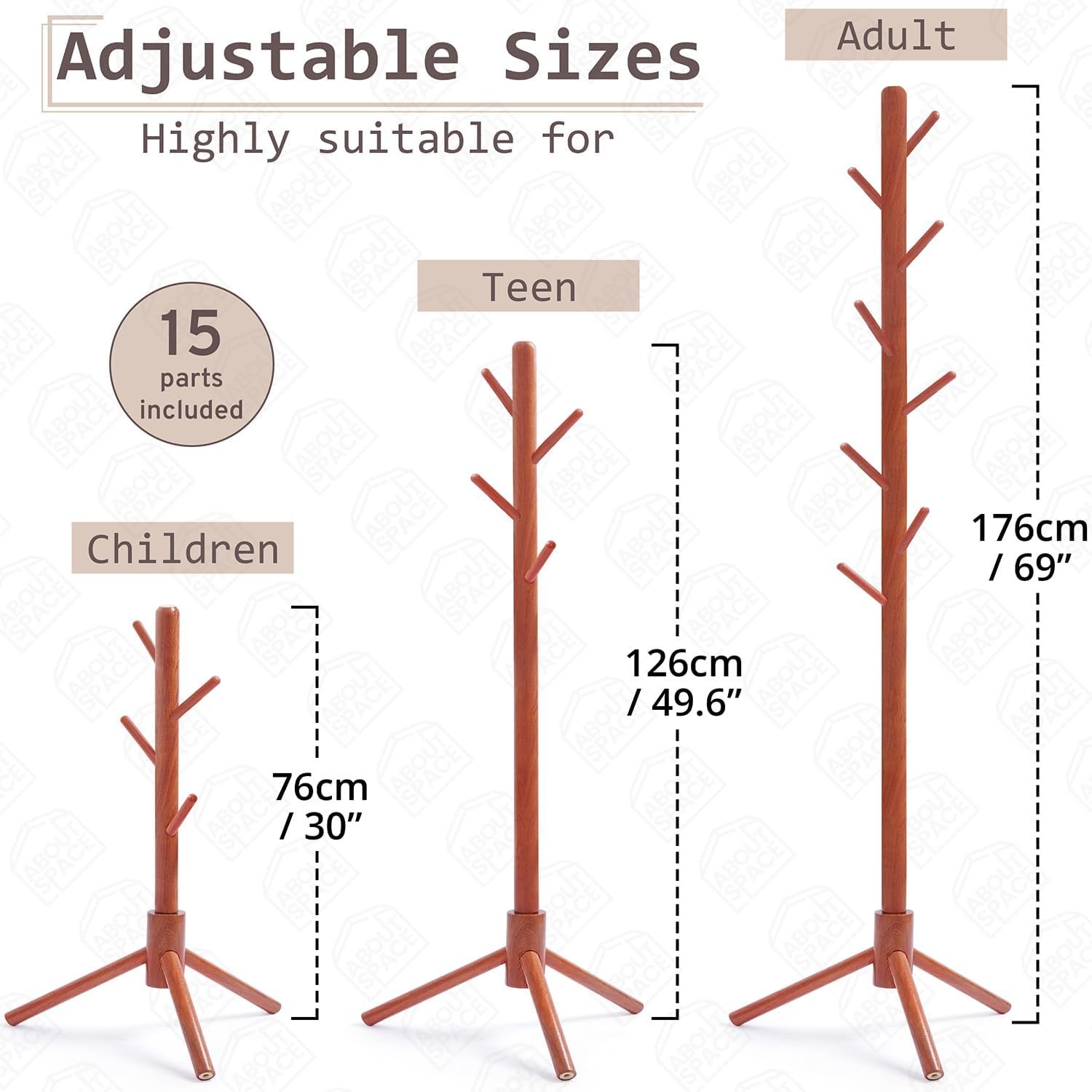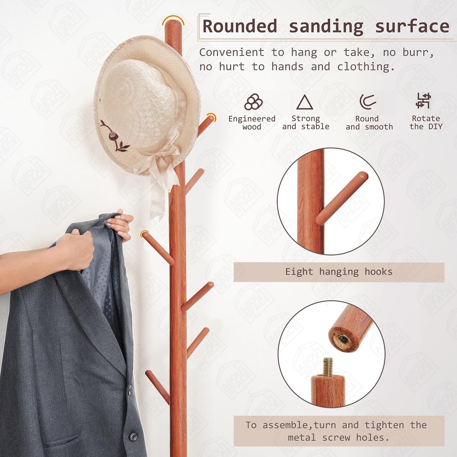 COAT HANGER STAND for HOME: ABOUT SPACE hanger stand for clothes hanging is well-designed with a stylish appearance, optimal stability, and easily supports multiple garments. 8 multifunctional hooks meet your daily hanging needs. The detachable sections allow you to customize the coat stand tree height according to your family’s needs.