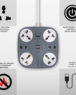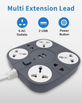 ADDMAX Extension Cord with USB – 6 Power Socket with 2 USB Ports | 1.8 Meter Heavy Duty Cord | 10A 220V Multi Plug Extension Board | Fire Flame Proof Extension Cord for Home & Office – Grey