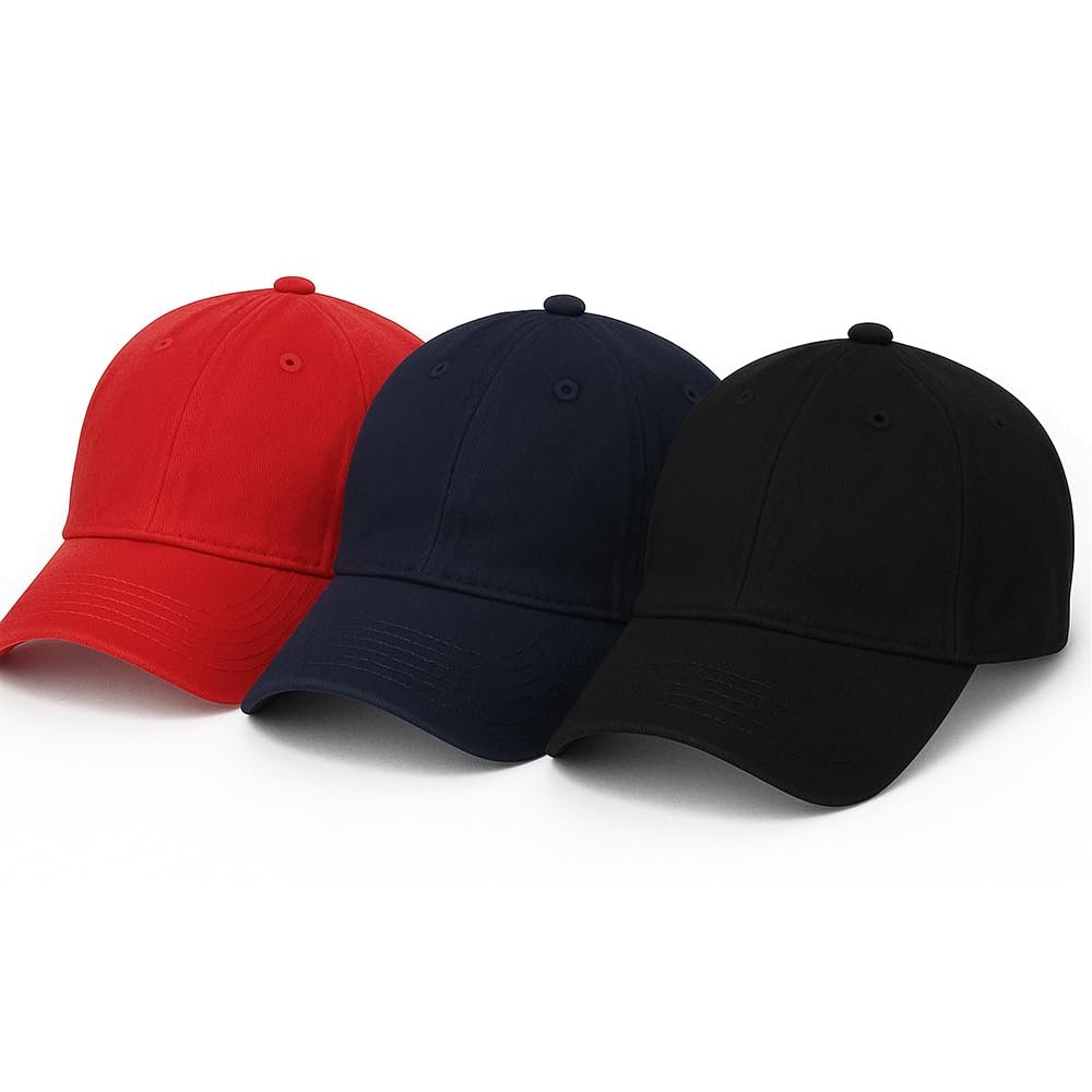 Amazon Brand – Anarva Unisex Cotton Baseball Cap Combo Pack of 3 – Red, Navy, Black Color