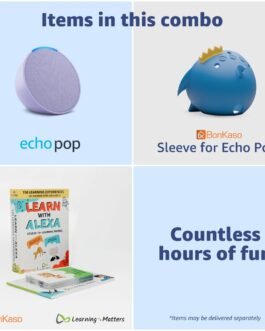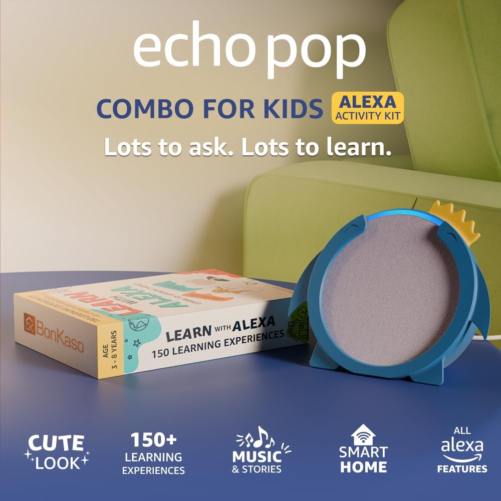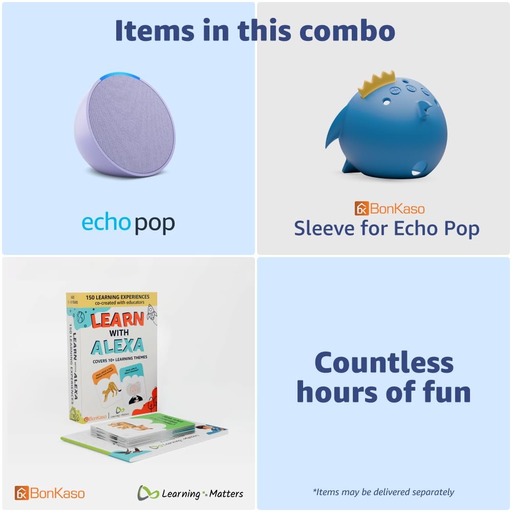 This combo contains Amazon Echo Pop (Purple), cute silicone Shark sleeve and Alexa activity kit with over 150 learning experiences.