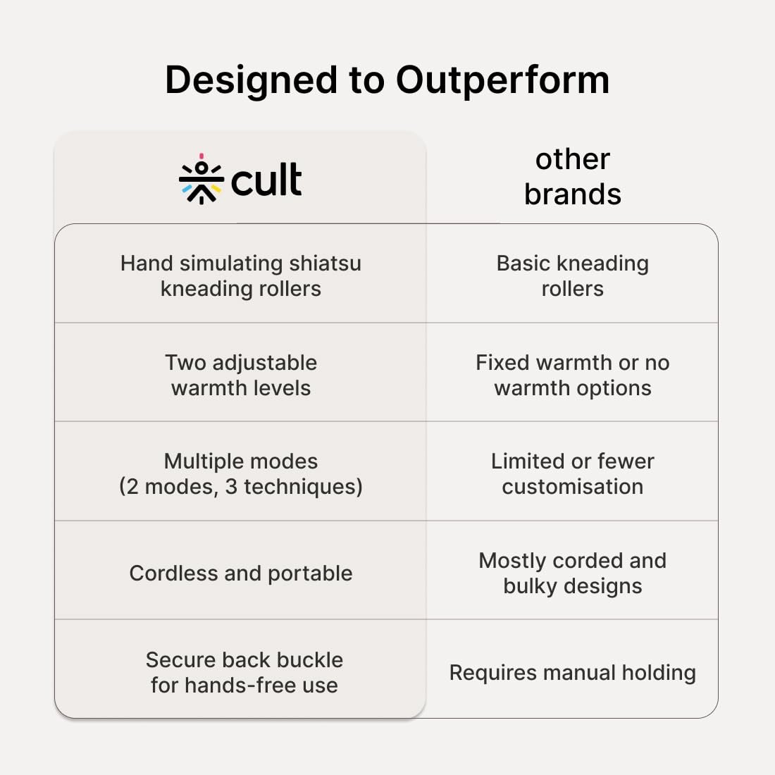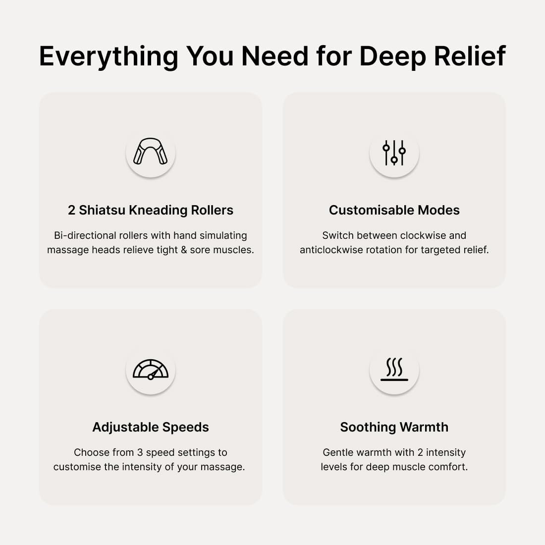 MULTIFUNCTIONAL – cult Deep relax comes with 2 modes, 3 speed intensities, and 2 heat settings. Massage heads that mimic hand techniques to relieve muscle pain and fatigue.