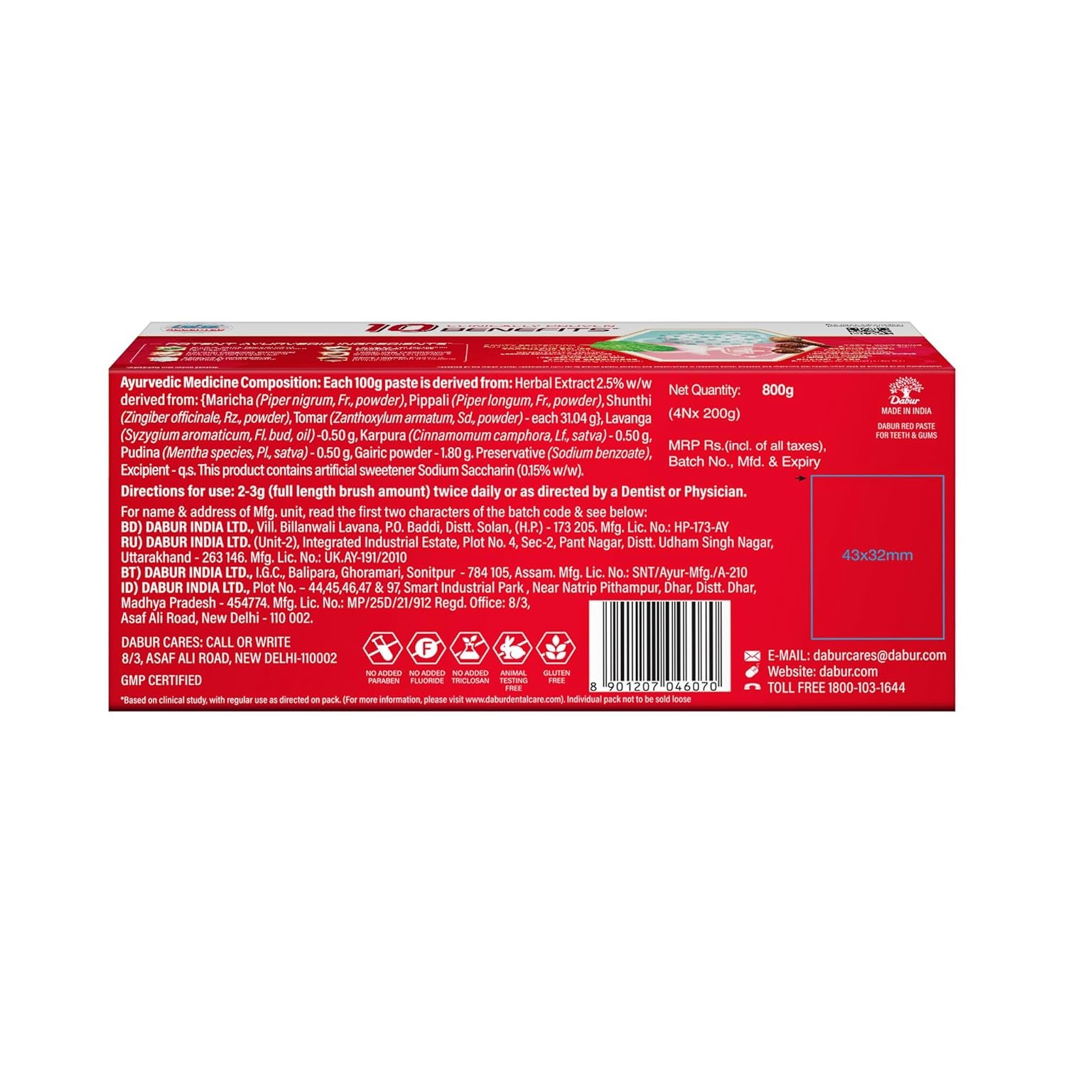 DABUR RED PASTE has a clinically proven formula that fights against 7 DENTAL PROBLEMS 1) TOOTHACHE, 2)CAVITIES, 3) plaque, 4) germs, 5) bad breath, 6) yellowing, and 7) bleeding gums