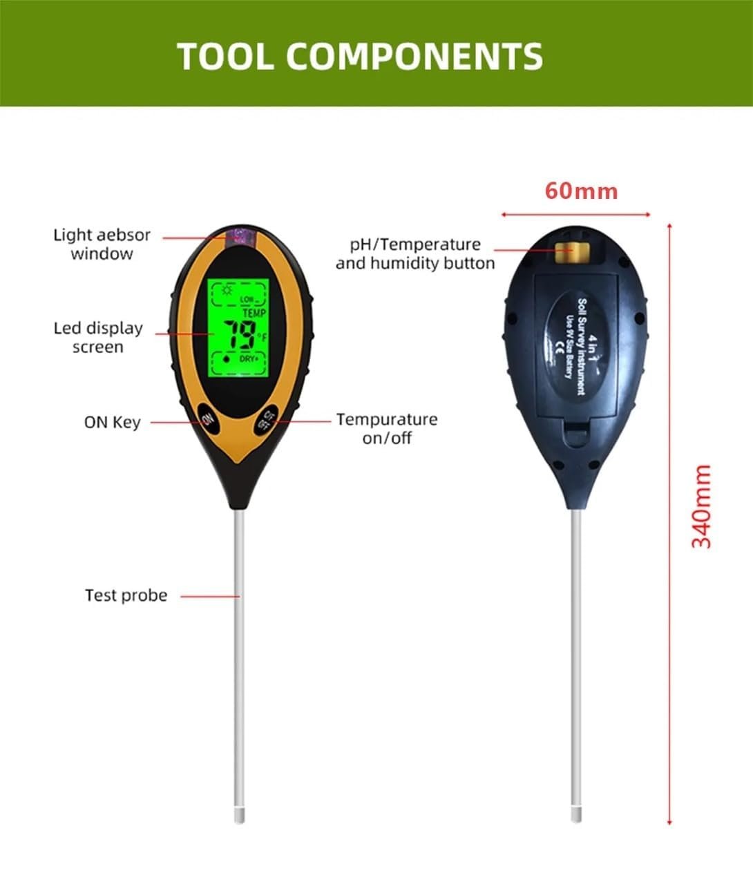 The sensitive 200mm probe and light sensor window provide 5 units of accurate & precise measured results, ph, moisture, sunlight, °c & °f (soil & environment).