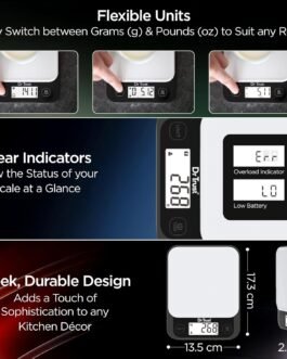 SLEEK, DURABLE, AND SAFE DESIGN: Crafted with durable, food-safe ABS materials, our Digital Weighing Machine for Kitchen ensures hygienic use in the kitchen. Low battery and overload indicators guarantee optimal performance and durability. Its sleek, compact design adds a modern touch to your kitchen decor and fits conveniently in any drawer or cabinet.