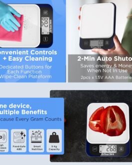 PRECISION WEIGHING WITH MULTI-UNITS: Powered by four high-precision sensors, the digital kitchen scale delivers accurate results down to 1g, with a weighing capacity up to 5kg. Easily switch between grams, ounces, pounds: ounces, and milliliters (for both water and milk). The built-in TARE function ensures that only the ingredients are measured—excluding the weight of any container or plate. Ideal for baking, portion control, and preparing recipes from around the world with confidence.
