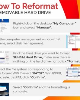 Note: If you encounter compatibility issues with the factory formatted file system on your hard disk, consider reformatting it following the steps in the image. This ensures better alignment with your computer‘s operating system, allowing for smoother functionality. What’s Included: 1 X Portable Hard Drive, 1 x USB 3.0 Cable, 1 x User Manual.