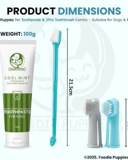 Foodie Puppies Enzymatic Toothpaste for Dogs Helps in reducing plaque and tartar buildup. Freshens Breath, Brightens Teeth and supports the overall dental hygiene of your pet. Foodie Puppies Toothbrush is the perfect way to maintain oral hygiene for your dog. It is very important to brush your pet’s teeth on a regular basis. There are two brushes in the same pack for the hard to reach places as it comes with a long handle. You just need to add some specially formulated toothpaste to ensure optimal level of hygiene. Regular brushing will help you to maintain healthy gums and teeth for your pet while getting rid of bad breath. Most of the dog toothpaste have anti-microbe and anti-bacterial properties, which help to prevent any plaque and bad breath causing bacteria. Double ended Dog Cat Toothbrush with long handle (to reach back teeth), soft bristles and tapered heads. The choice of a large head and a small head allows the removal of plaque and food debris. The two finger Dog Teeth Care Brush allows the pet owner to place the brushes on the finger to clean pet teeth. Plastic toothbrush sets on your fingers to avoid being bitten Package Included: 3Pcs Dog Toothbrush(1pc*long brush,2pcs*finger brush)