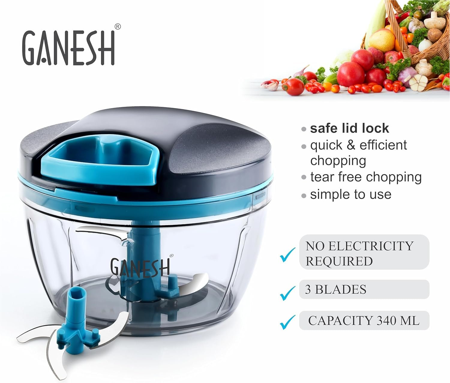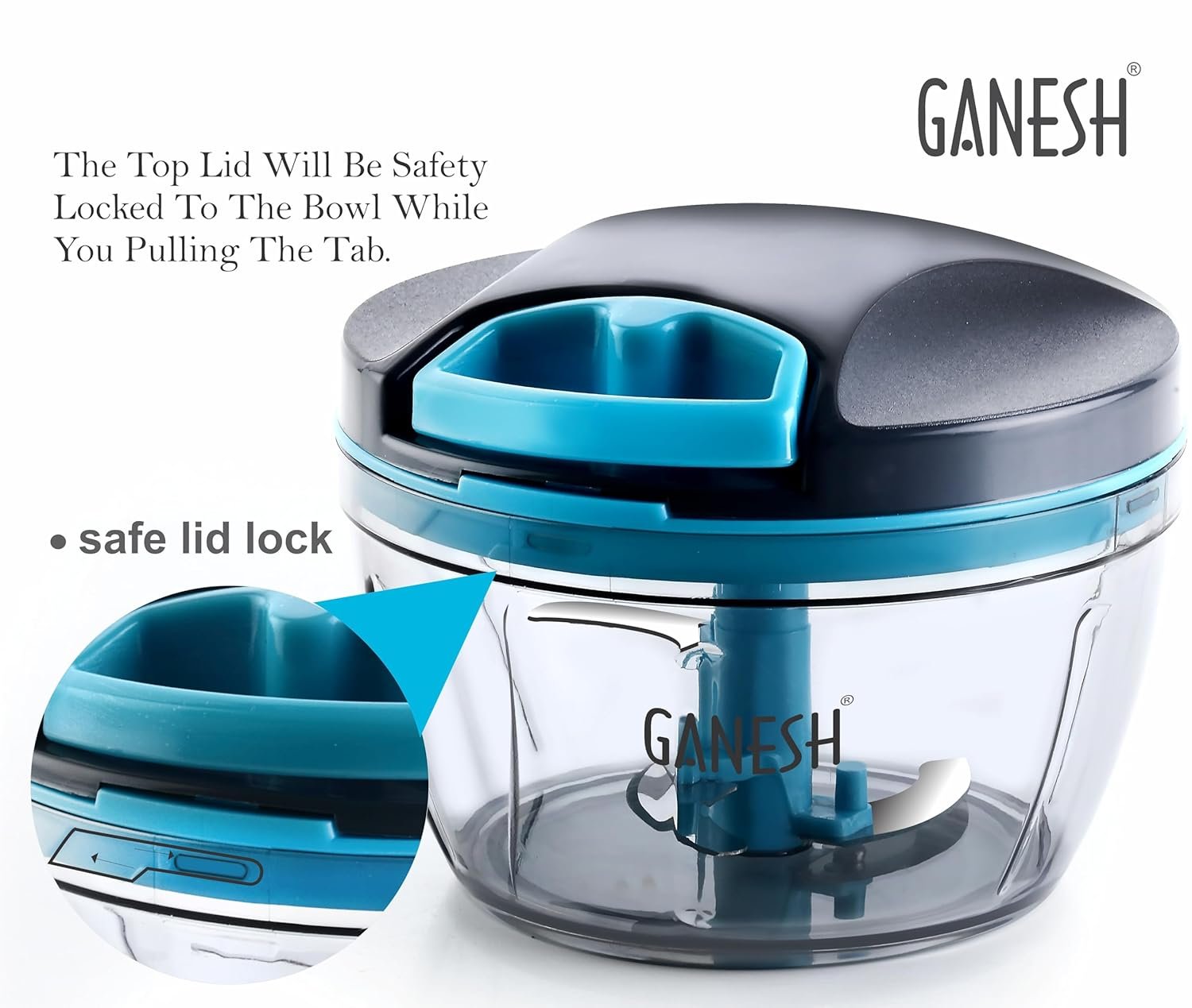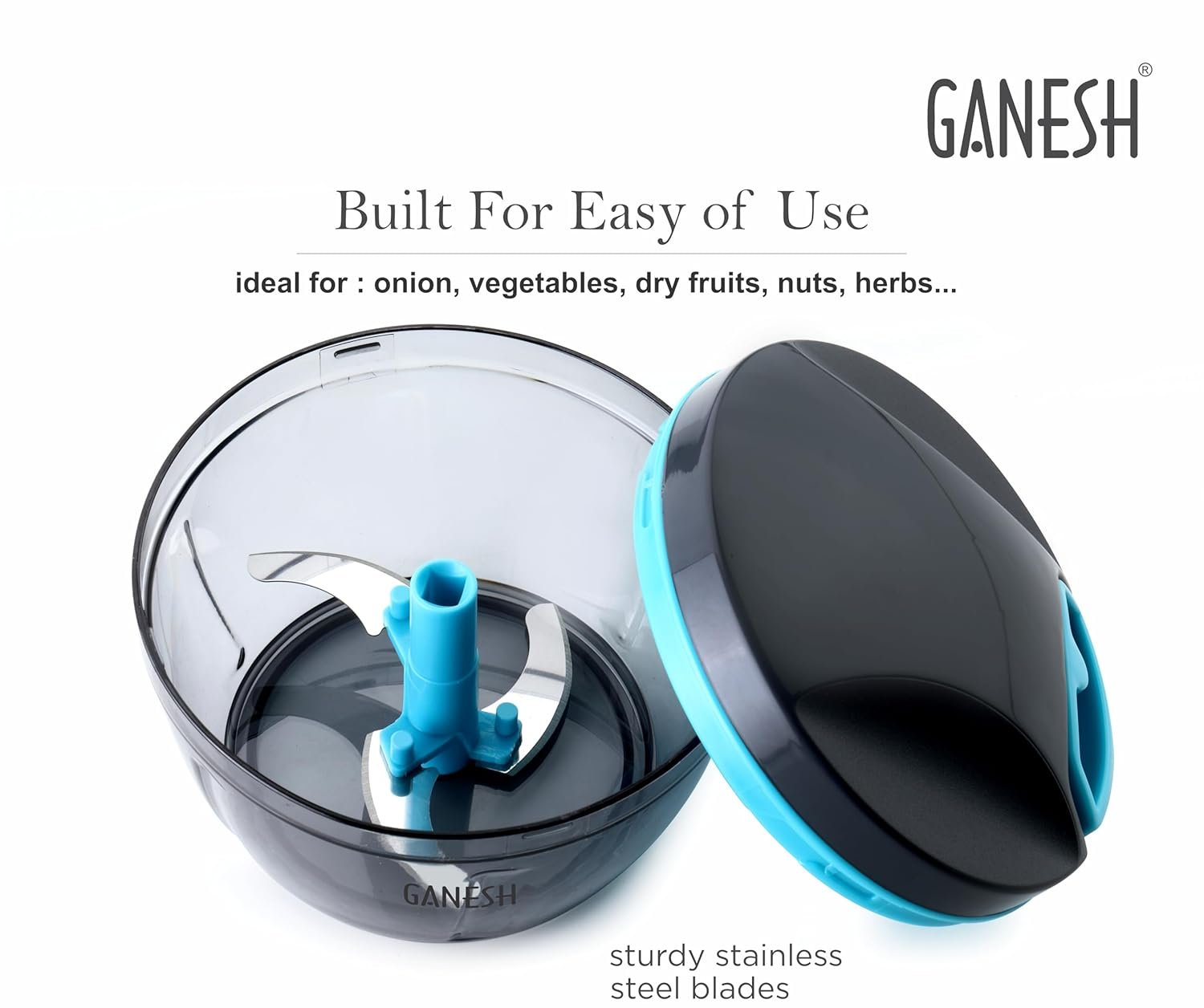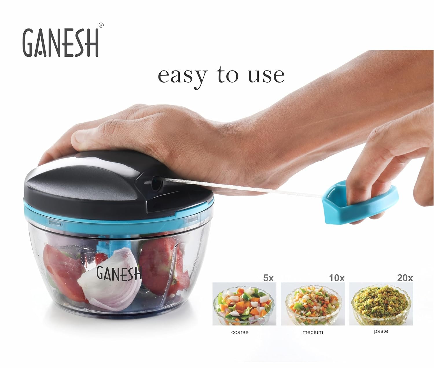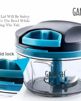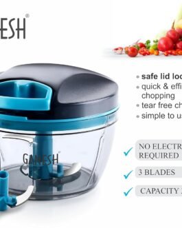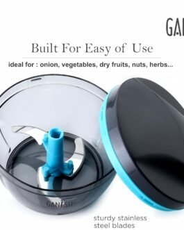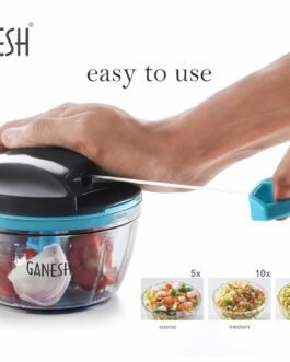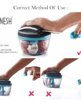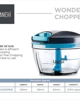 GANESH Wonder Chopper is Ideal for chopping and cutting onion, vegetables, dry fruits, nuts, herbs, etc. It has Sturdy Stainless Steel Blades for quick and efficient chopping. It provide Tear Free Chopping for Onions, Garlic, Chilly, Etc. Make it instant-Paste, Chopping, Gravy, Salad, Chutney, Food Preparations, etc. using Wonder Chopper. Easy to Clean and Disassemble. Wonder Chopper is made From Food grade BPA free Virgin Material. No Electricity required. Four Safe lid locks ensures Safety during use. It has Non-skid base. It gives about More Than 380 Knife Cuts in less than 20 Sec. It Cuts and Chops with easy hand pull Cord function.Use and Care : Take the Chopper Container and Fix blade holder in the Centre. Cut the ingredient in to appropriate size and add evenly around the blade. Don’t Fill the bowl more than 3/4 of bowl Capacity. Close the Container with Chopper lid and Make Sure it is locked Securely. Pull handle Parallel to bowl. Sharp blades handle with Care. Keep out of the reach of Children.