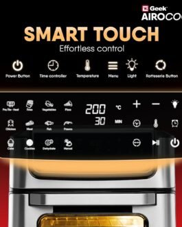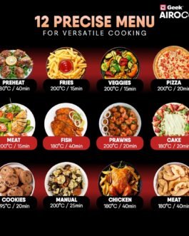 One-touch Operation: The Geek Airocook Helix 12L Airfryer Oven boasts 12 preset menus and a user-friendly LED touch screen, simplifying all your culinary desires into a single touch click. Additionally, you have the flexibility to fine-tune temperature (up to 200°C) and time (up to 60 minutes) to suit your taste.