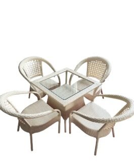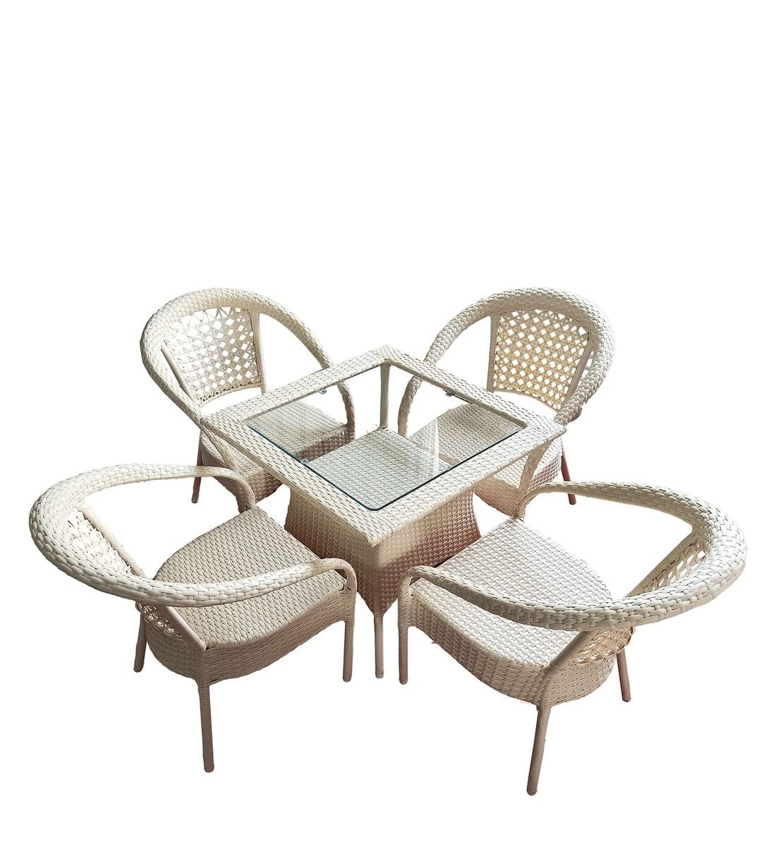 Upper Material – PU Wicker, Frame Material- Mild Steel, Base – PU Solids, Foam Density – 40 Density || Weight Carrying Capacity of Chairs 120 KgGarden Furniture Set || 4 Chairs || 1 Table with Glass Top || Table Size ( 28 Inch X 28 Inch )