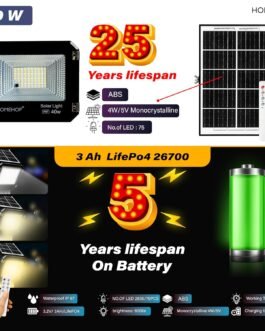 SolarPanel – 4W/5V MonocrystallineBattery– 3.2V/3AH LiFePO4Durability – ABS MaterialWaterproof – IP67 RatedLongBackup – 12H Auto ModeFastCharge – 6–8 HoursAutoControl – Optical Day/Night Sensor