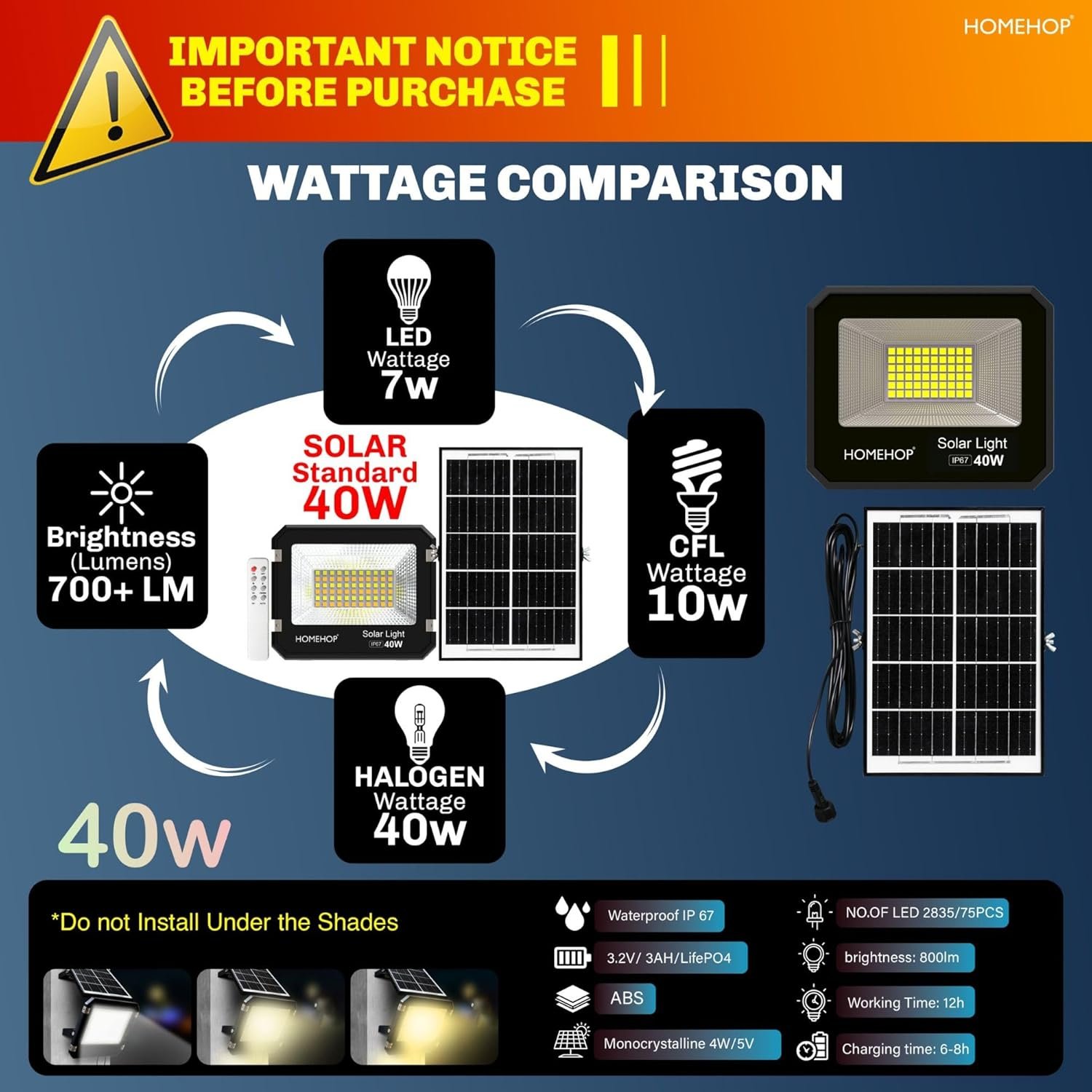 【The Bright Solar Flood Light】 This Homehop solar light outdoor is a powerful solar flood light designed for balcony garden setup, patios, and driveways. With LED solar light outdoor waterproof performance, it features focus lights for wall, balcony solar light, and wall lamps outdoor. Emitting white brightness, it’s ideal for outdoor wall lights waterproof, garden lights outdoor, outdoor solar lights, and solar lamps for home with long-lasting LED focus light outdoor, led light for outdoor.