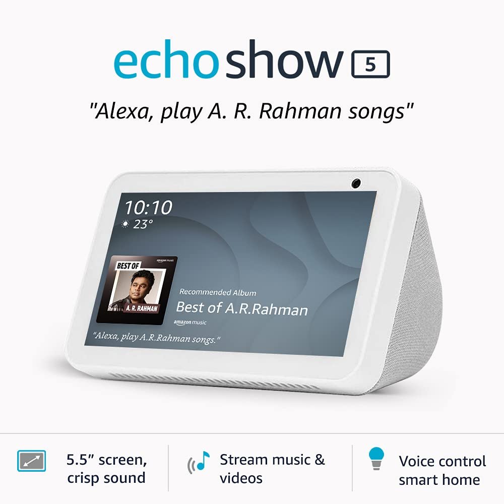 Echo Show 5 is a smart speaker with 5.5” screen and Alexa that can be operated by voice and can fit on your bedside or coffee table. Alexa speaks English & Hindi.