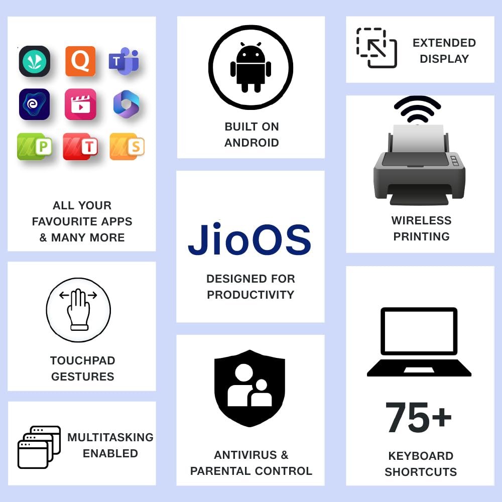 Key Features Multi-window Support Native App & Third-Party App Support Advanced file management (NTFS, FAT32 & exFAT) In-built JioSphere Internet Browser SoftMaker Office 2024 included Data sharing with existing Jio SIM Extended Display & Peripherals Support