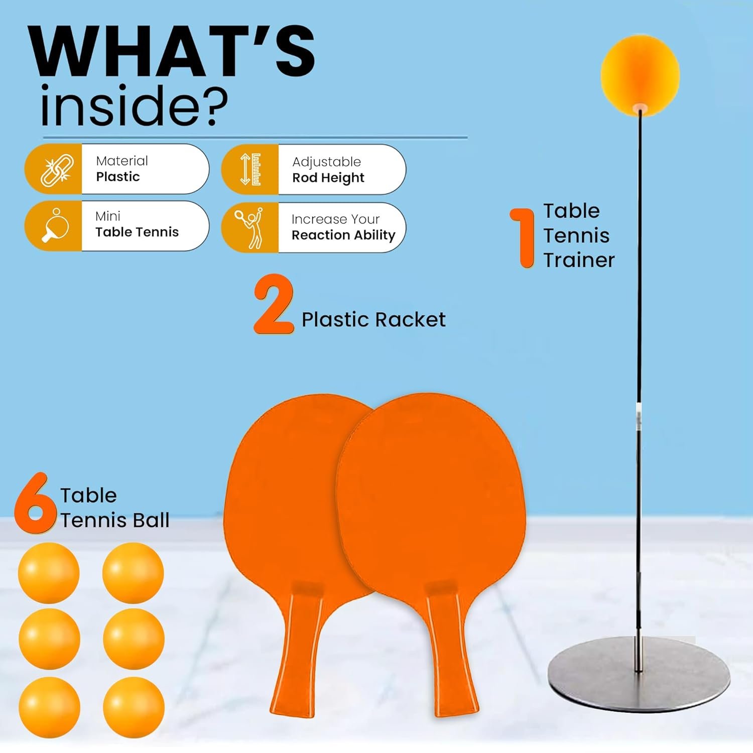 The box includes: 2 Durable Racket , 4 Lightweight Table Tennis Balls , 1 Flexible Rod & 1 Fixing Rod , 1 Sturdy Metal Plate Base & 1 Screw