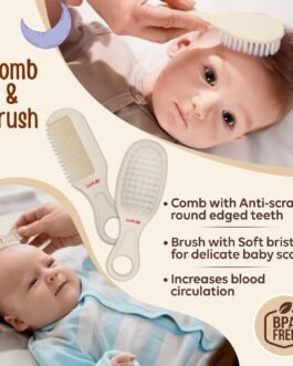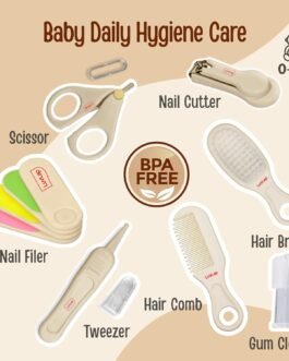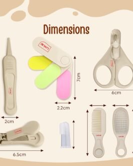 This complete new born oral, nail and hair care set includes: One Finger Brush to clean Baby Tongue & Gum, Hair Brush with Soft Bristles to comb Delicate baby Scalp, Comb with Anti-Scratch Round Edged Comb Teeth, Easy Grip High Quality Nail Scissor, Nail Clipper to shape and polish baby nails, Tweezer to remove nasal congestion and Nail Filer to Smoothen the nail edges.
