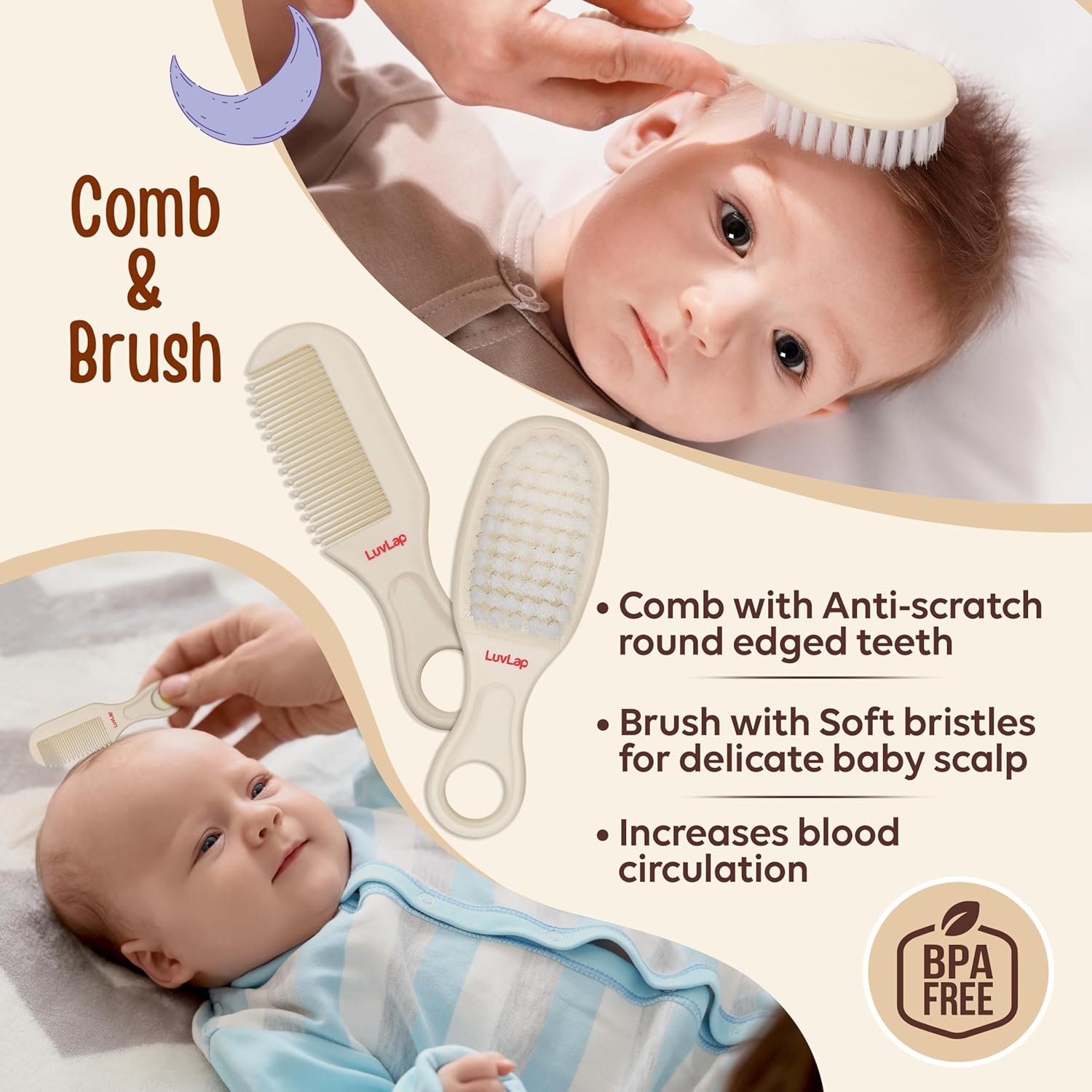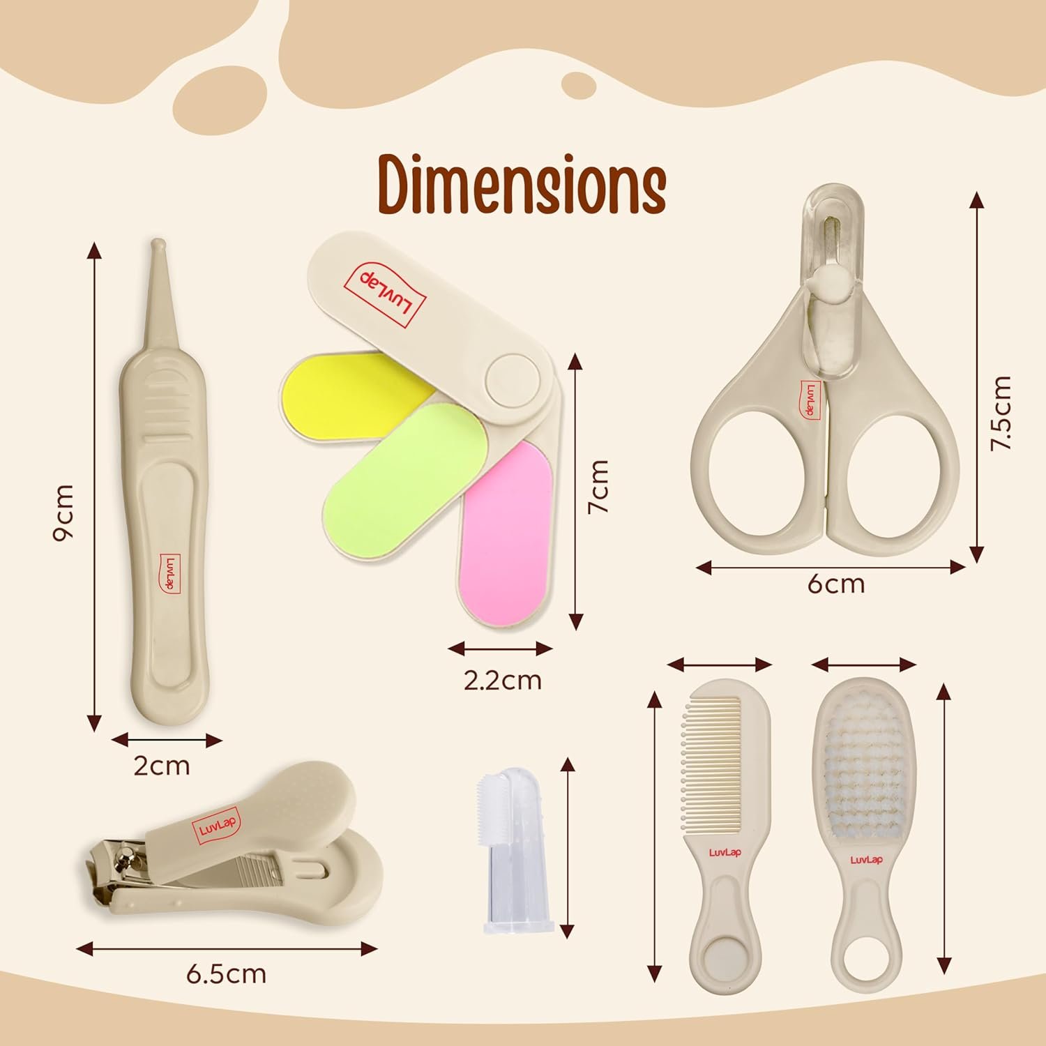 Scissor blades with rounded edges and combs with round teeth ends avoid pricking delicate skin. The fine nylon bristles of the hair brush, gently brush baby’s scalp. The silicone finger brush keeps baby gum and tongue clean