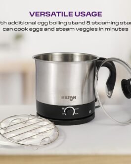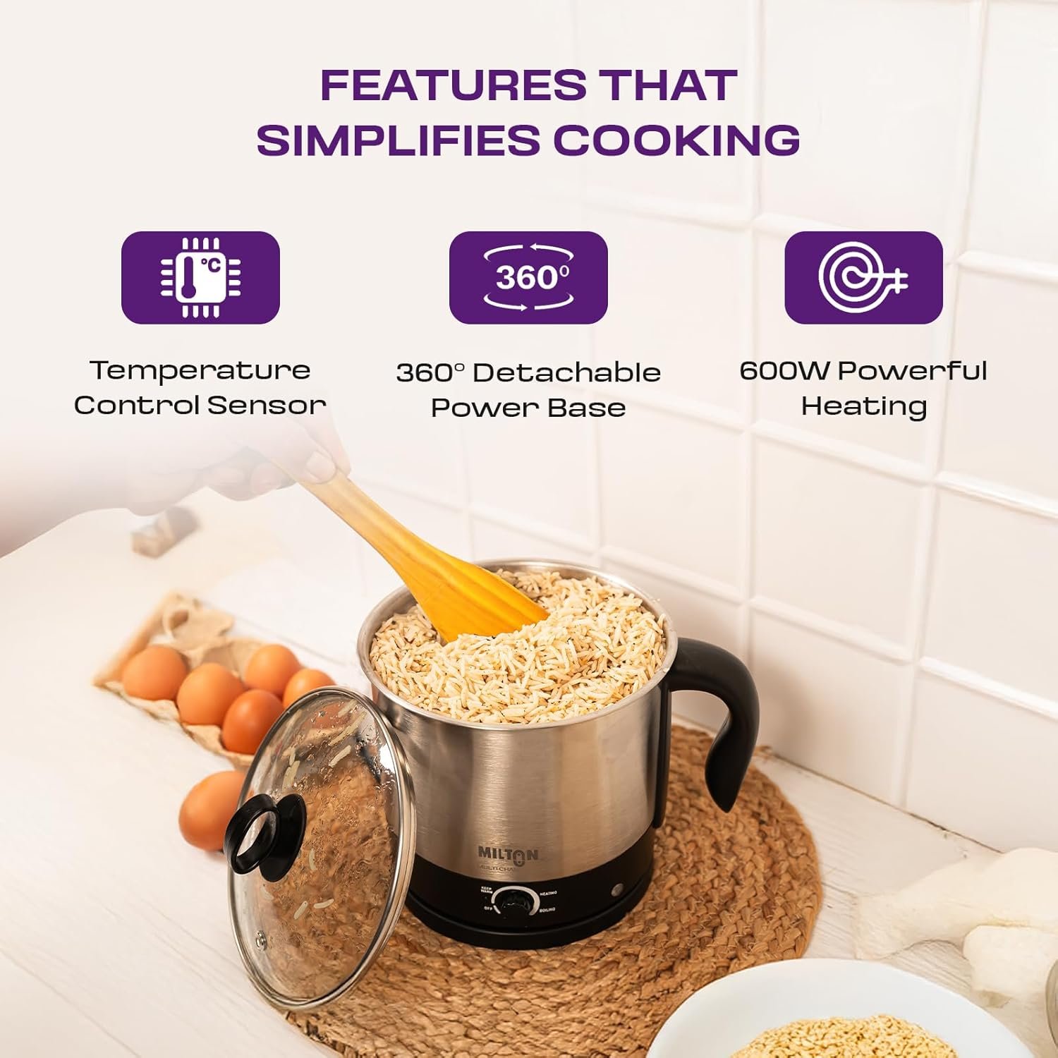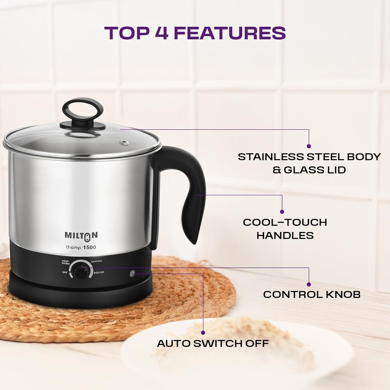 Milton Champ Electric Multi Cooker With Steamer | Multipurpose Electric Kettle & Cooker For Hostel, Home & Travel | 1.5 Litre, 600W | Stainless Steel Body | 3 Boiling Modes | 1 Year Warranty