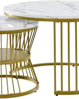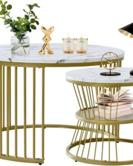 NEST NATURE HAVEN Round Coffee Table, Modern Nestings Table Set of 2, Sofa Side Table with Marble Veneer Top and Metal Frame, End Table for Living Room Bedroom Home or Office (Golden White)
