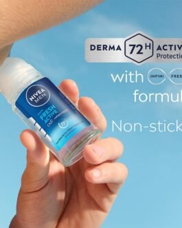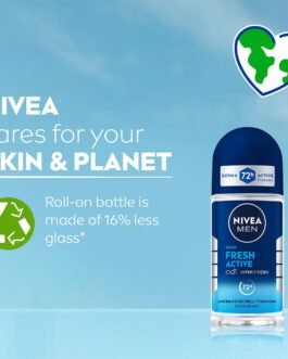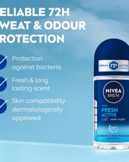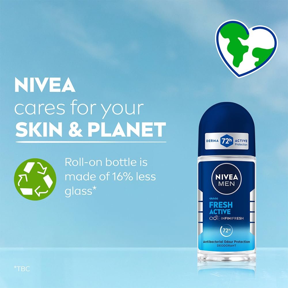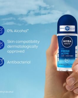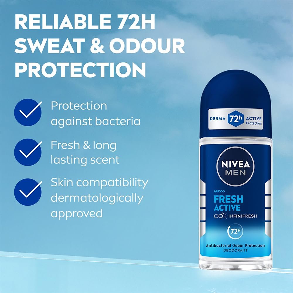 NIVEA MEN Fresh Active 50ml Deo Underarm Roll On | With Fresh Ocean Extracts Scent| 72 H Freshness| 0% Alcohol | Dermatologically Approved & Paraben Free Formula