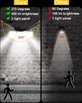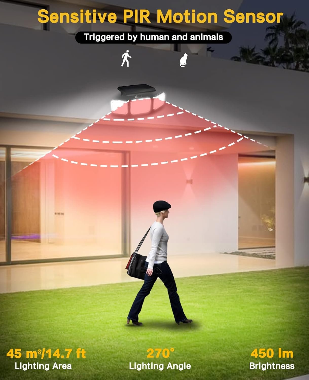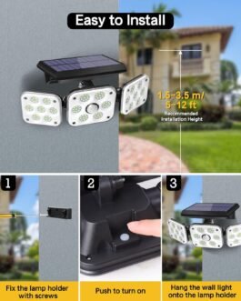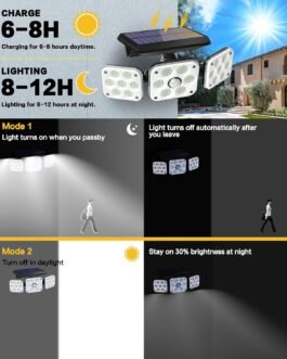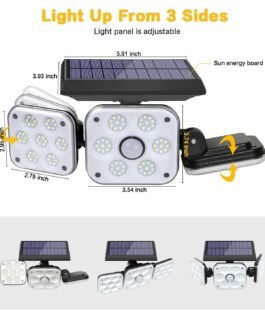 With 3 adjustable heads, the solar lights outdoor have a 270° wide lighting area with 6500K and 1200 lumens super brightness. You could adjust the angle according to your needs. With the waterproof system and motion sensor, the motion sensor outdoor lights have high sensitivity for motion and a long lifespan. It’s your perfect outdoor light choice!