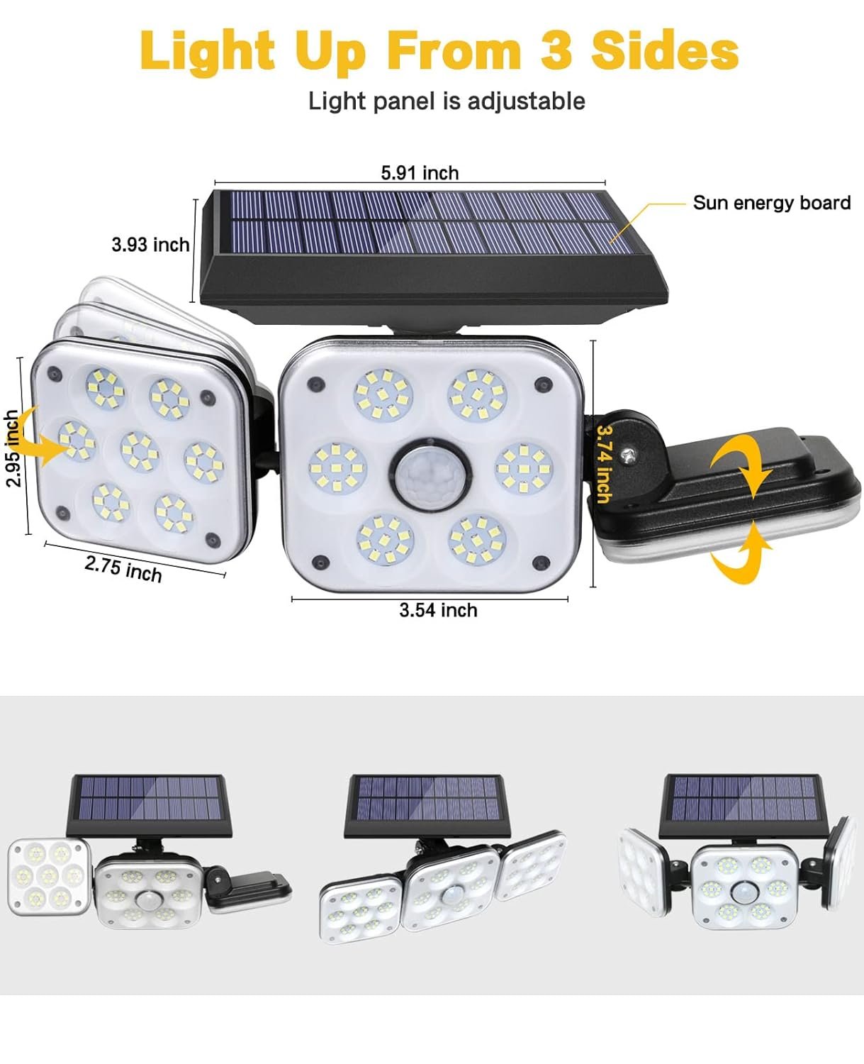 【Adjustable 3-Head Solar Light】 The powerful solar wall light is equipped with 3 lamp heads that can be rotated vertically or horizontally. Up to 270° beam angle creates a wider range of brightness, brighter than most 70/100/108 LED solar lights. This solar spotlight is ideal for sidewalk, front door, yard, wall, garden, garage.