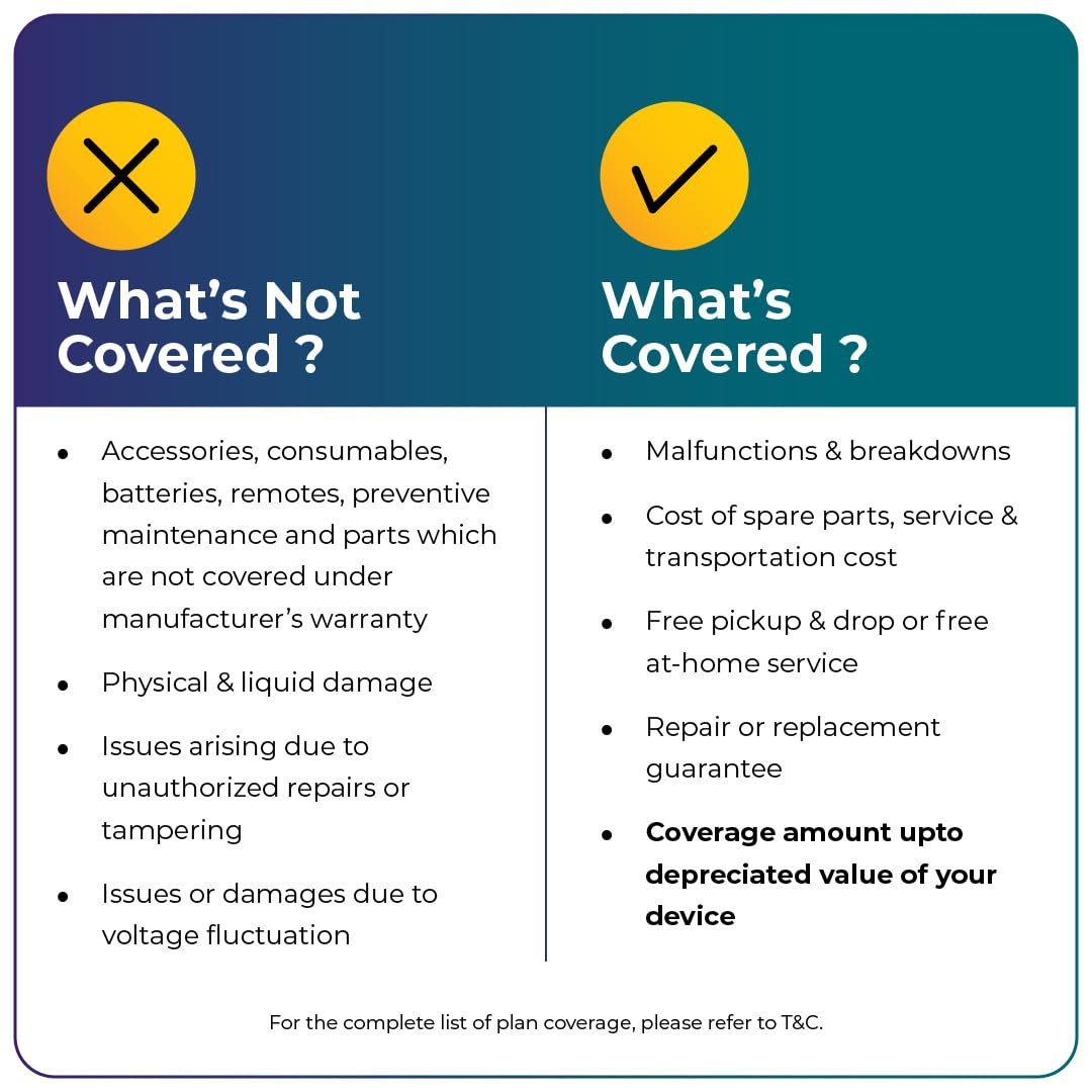 ELIGIBILITY: The plan can be purchased only for new devices bought on the Amazon platform and WITHIN 30 days of device purchase or before the expiration of the manufacturer’s warranty, whichever occurs first. You can purchase this plan only for devices that have AT LEAST 1 Authorised Service Centre anywhere in India. The sum of the manufacturer’s warranty and extended warranty CANNOT EXCEED 5 YEARS. This plan does not cover products or devices purchased or used for COMMERCIAL purposes
