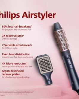 The Philips AirStyler is a hair volumizer with 2 different attachments for easy, daily hair styling. The AirStyler uses warm air that is evenly distributed across the brush, while the ionization function helps your hair shine more and also removes static build-up in the hair. The flexible heat and speed settings provide full control over your styling experience. Add more volume, create waves, straighten or define your hair in different styles with different attachments. When hair care is a top priority, the care setting ensures that your hair dries quickly but is protected from overheating with consistently strong airflow, but with a constant temperature for care. Styling the hair is quick and easy thanks to the ceramic plates with argan oil. Hair feels as silky smooth as it looks.