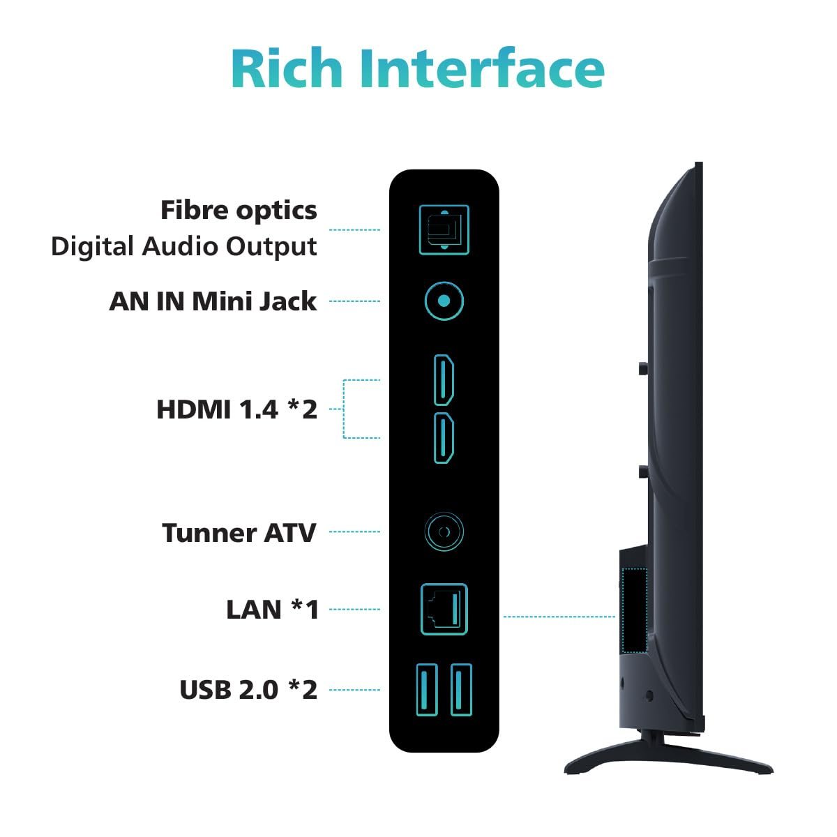 Connectivity: 2 HDMI ports to connect set top box, Blu-ray speakers or a gaming console | 2 USB ports | IR Port to control connected devices like DVD / STB Players, DVP Sattelite Port.