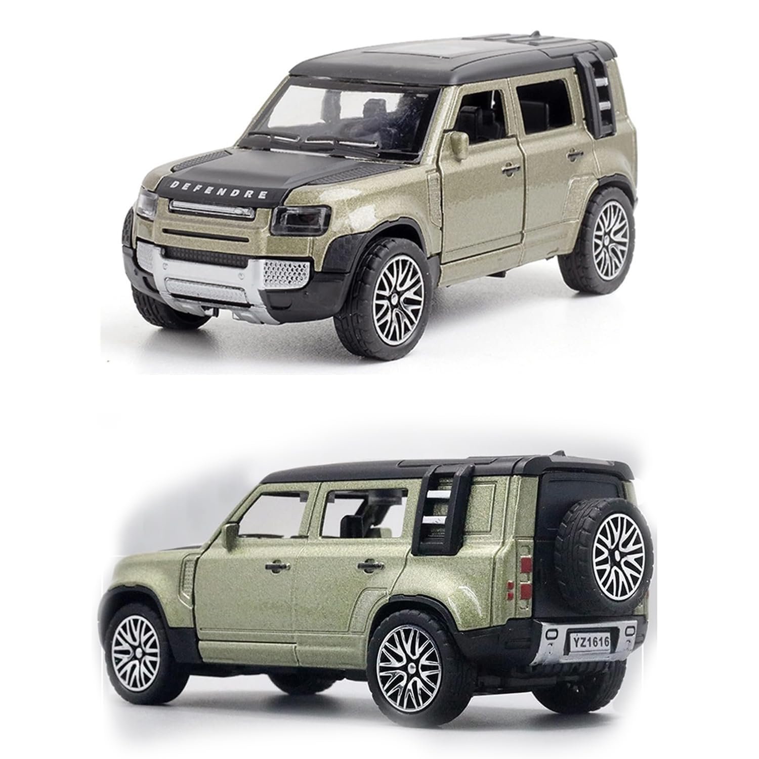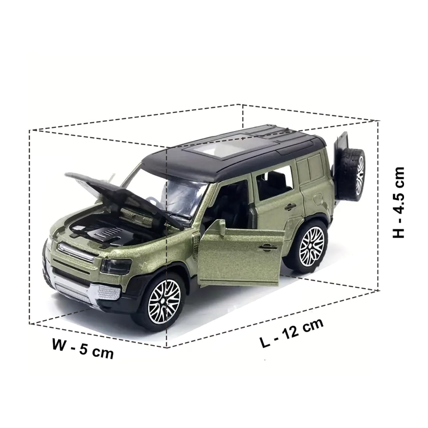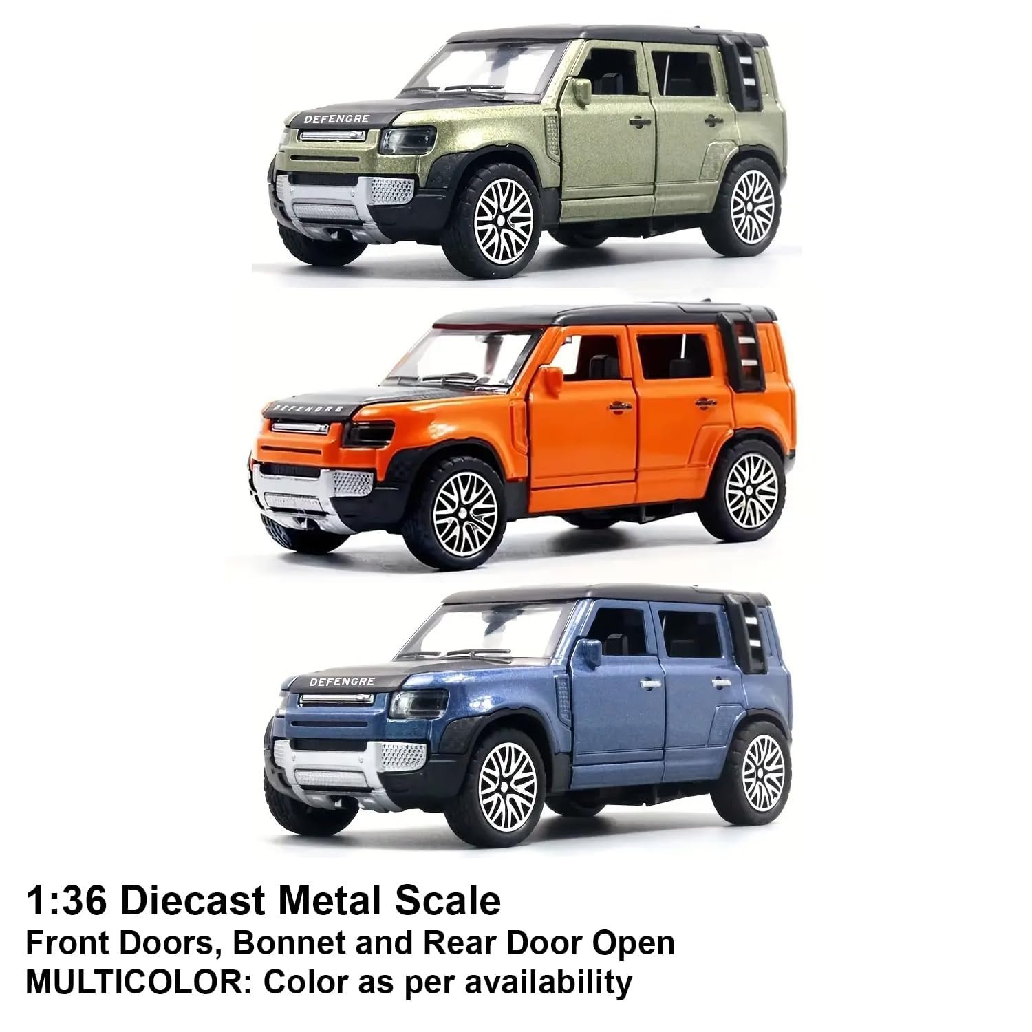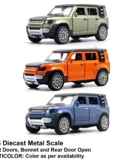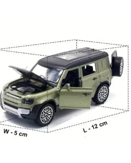 Introducing the 1:36 Diecast Metal Scale Model of the Land Rover Defender – an exquisite replica that brings the spirit of adventure to your fingertips.Openable Front Doors: Enhance the play experience with openable door, bonnet, & rear door. Your child can easily access the finely crafted interior, allowing for imaginative role-playing adventures.Perfect Gift for Aspiring Adventurers: Whether it’s a birthday, holiday, or a “just because” surprise, the 2023 Land Rover Defender Diecast Toy Car makes for an exceptional gift.Designed for both play and display, this Land Rover Defender scale model comes with push-back action, adding an interactive element to your miniature adventures. Whether it is conquering imaginary off-road terrains or proudly showcased on your collector’s shelf, this model caters to enthusiasts of all ages.
