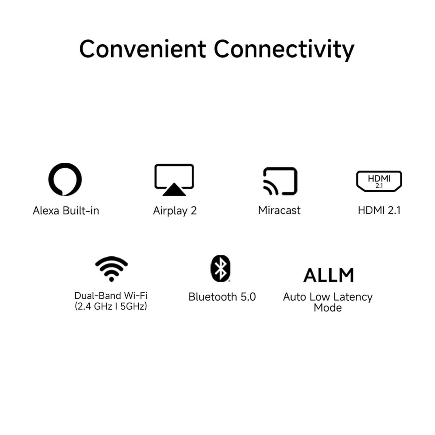Connectivity: Dual Band Wi-Fi (2.4 GHz/ 5 GHz) | 3 HDMI ports to connect set top box, gaming consoles, DVD or Blu-ray Players | 2 USB ports to connect hard drives and other USB devices | ARC | Bluetooth 5.0 | Ethernet | 3.5mm earphone Jack