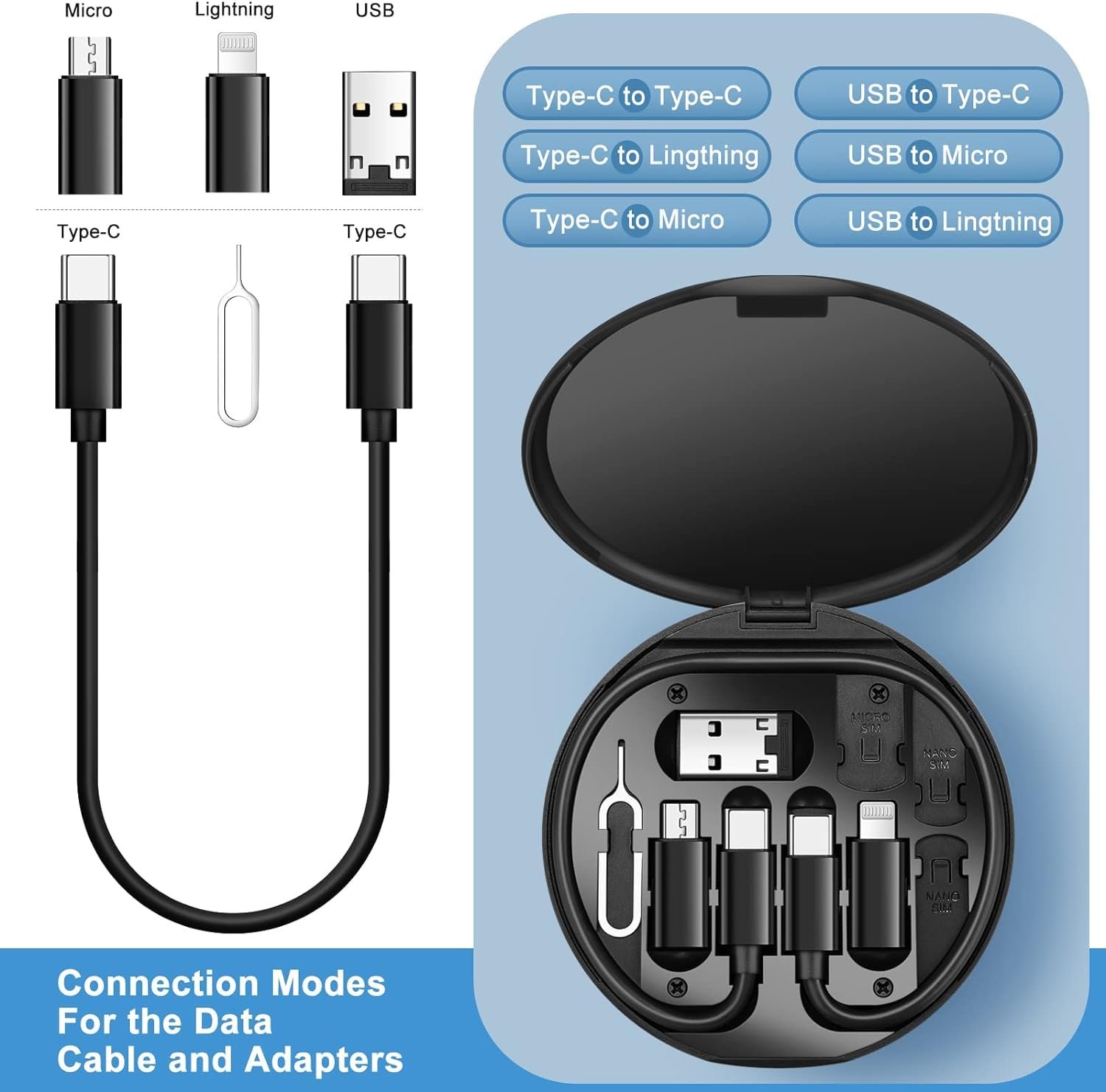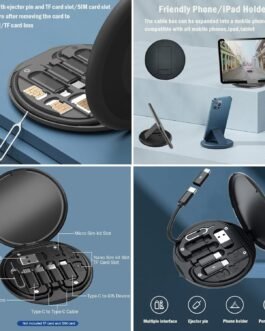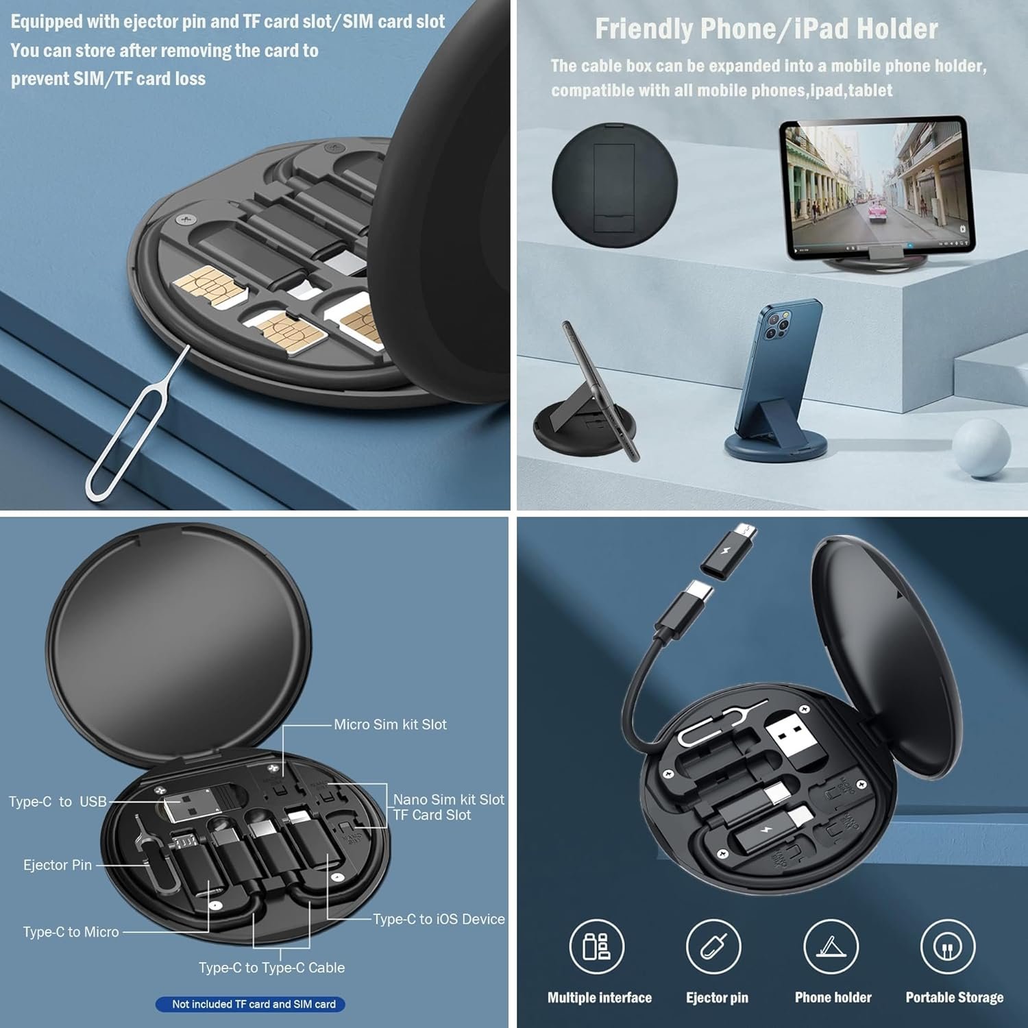 ROKTRY Multifunctional Data Cable Storage Box Adaptor for Lightning, USB-C and Micro-USB Devices Universal Data Transfer Cable Set Contains Card Storage,Phone Holder, Tray Eject Pin(Black)