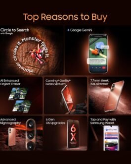 Monster performance – Lag free gaming, multi-tasking and more with 4nm processor with Vapour Cooling Chamber, 2.4GHz, 2GHz Clock Speed with Octa-Core Processor. Long lasting battery that lasts up to 2 days with C-Type fast charging support. Binge, play, scroll, record non-stop and worry free. 6 years of OS and Security Upgrades, Tap and Pay with Samsung Wallet, Knox Security, Latest Android 15 Operating System having One UI 7.0, Now Bar, Voice Focus, Quick Share.