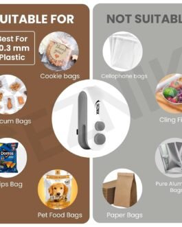 Works on Most Plastic Bags (< 0.3 mm): This sealer machine for plastic bags can reseal chip bags, snack packs, mylar bags, sandwich bags, and more—great for keeping food fresh and crispy. This mini sealing machine for food packets is not suitable for wraps, kraft paper, cellophane, or thin aluminum bags.