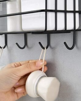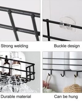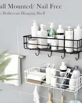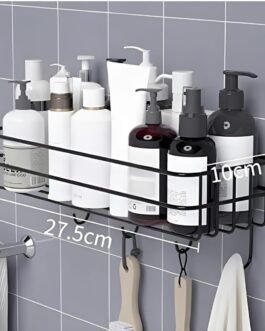 “Organize your space with this sleek bathroom shelf featuring built-in hooks for added functionality. Perfect for toiletries and towels, it’s made of durable material with a self-adhesive design for easy installation. No drilling required, making it ideal for renters. A space-saving solution for a neat and clutter-free bathroom!”
