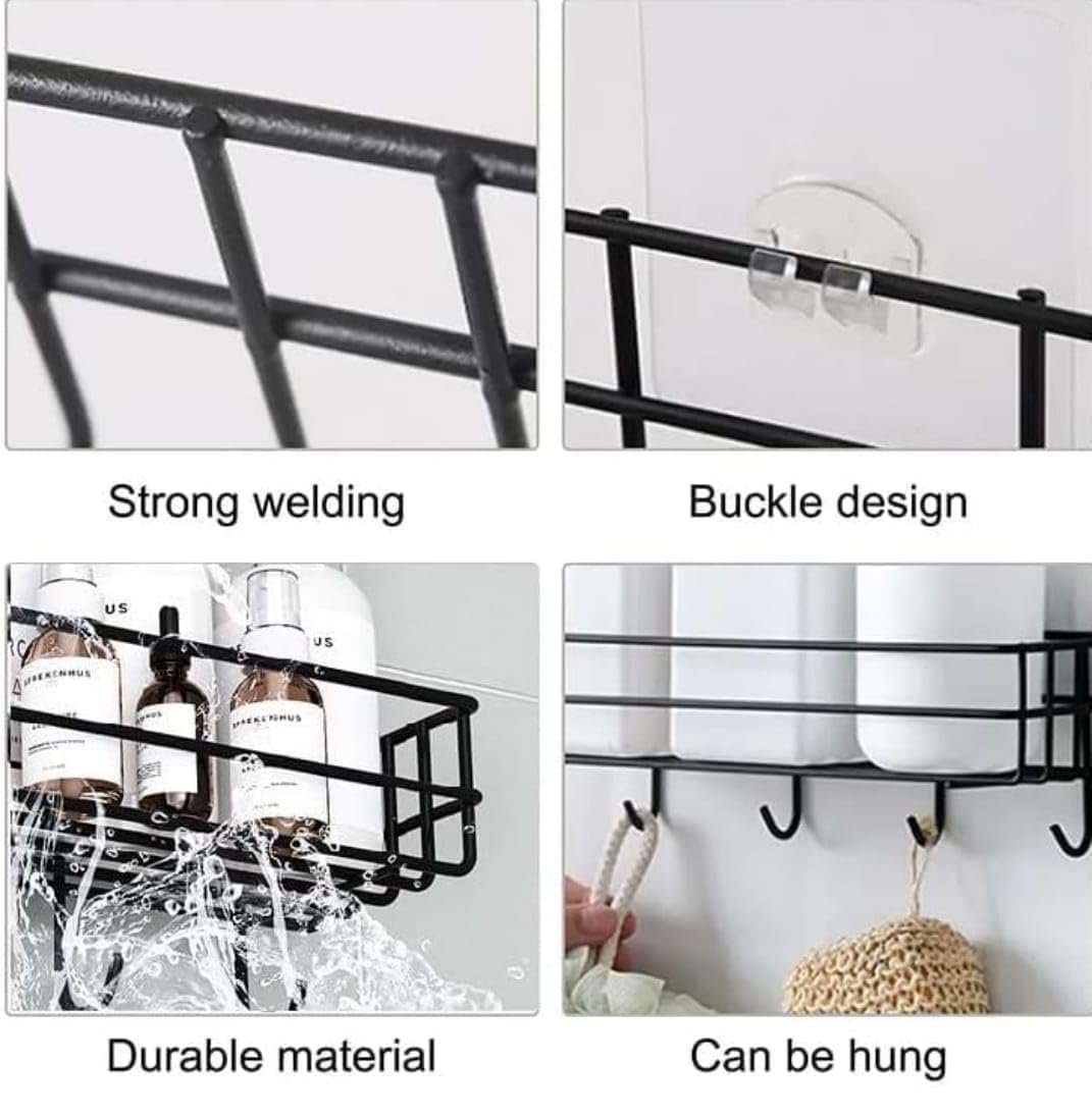 “Upgrade your bathroom with this self-adhesive shelf, designed with hooks and ample space for toiletries. Store shampoo, soaps, and skincare products while using the hooks for towels, loofahs, or razors. Its versatile design fits kitchens for spices or utensils, too. No drilling—just stylish, multi-purpose organization for any room!”