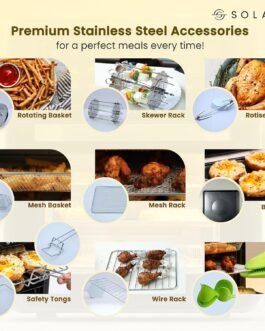Complete Accessory Kit: Includes 6 premium accessories—Crisper Wire Basket, Enamelled Tray, Rotisserie Basket, Wire Grill Rack, Tong, and Rotisserie Rod—plus a recipe booklet for endless culinary inspiration.