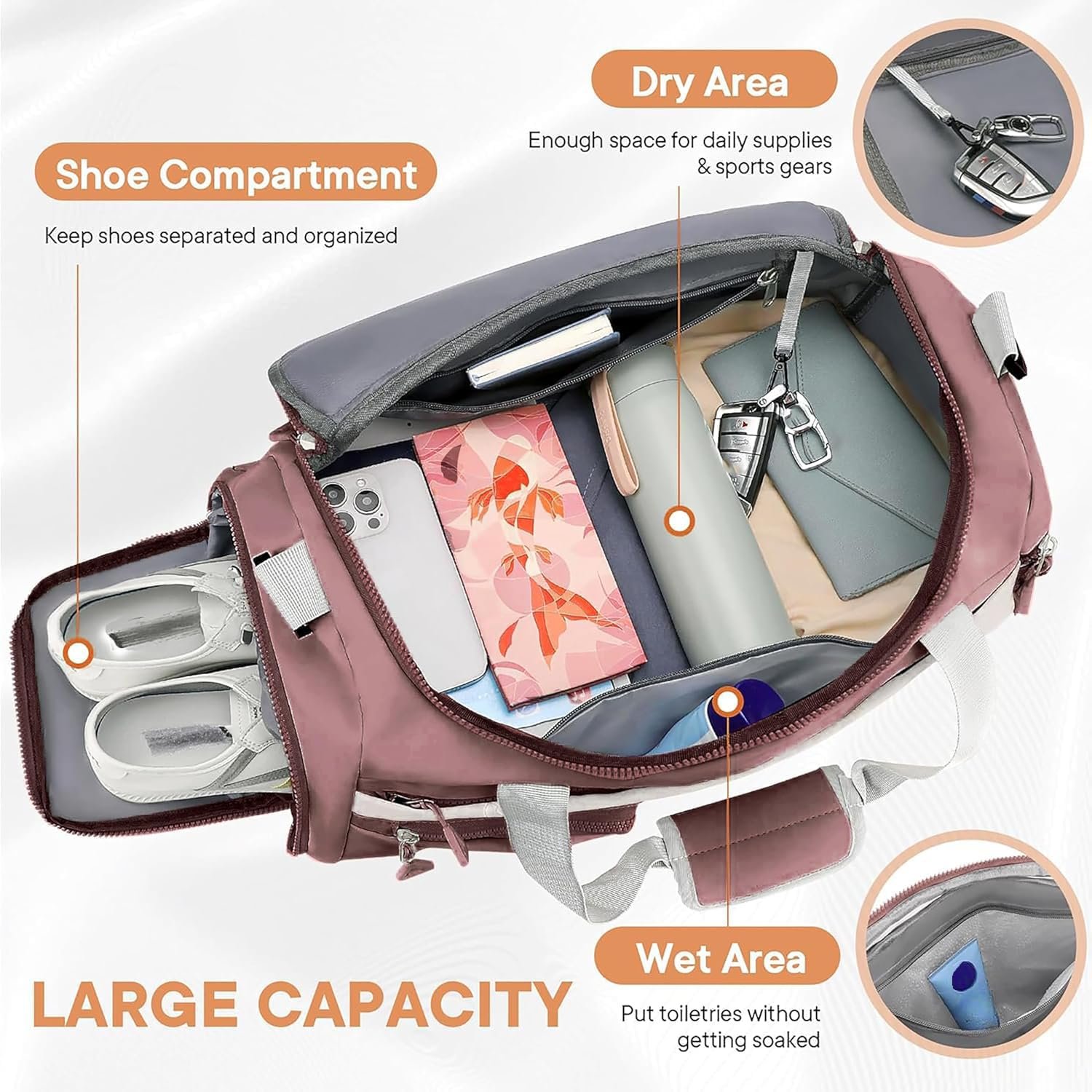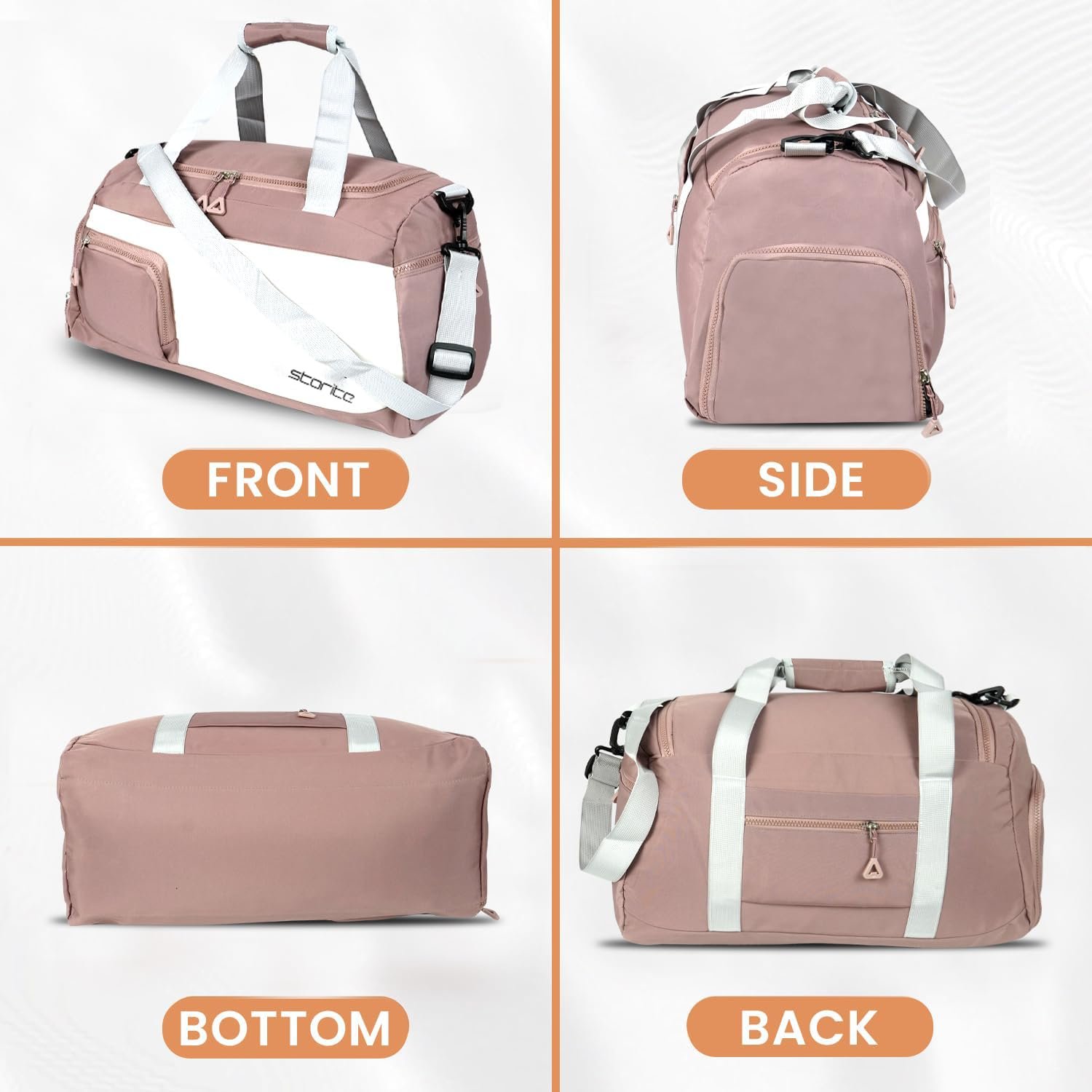 No of Compartments: 1 Main compartment + 1 small wet pocket + 1 shoe pocket + 1 side Mesh pocket & 1 back small zipper pocket & 1 Front Zipper Pocket