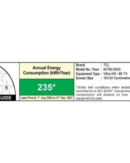 Smart TV Features: 4K QLED Google TV | 3GB RAM | 32 GB ROM | 64-bit Quad Core Processor| WIFI 5 | Google Assistant |Prime Video, Netflix, Hotstar, Zee5 and more| Web Browser | Screen Mirroring | Works with Alexa | Game Master | 288 Hz Game Acclerator | Multiple Eye Care | Eneygy Rating: 3 Star | Annual Energy Consumption: 235 kWh/ Year
