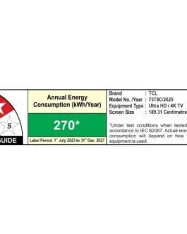 Smart TV Features: 4K QLED Google TV | 3GB RAM | 32 GB ROM | 64-bit Quad Core Processor | WIFI 5 | Google Assistant | Prime Video, Netflix, Hotstar, Zee5 and more | Web Browser | Screen Mirroring | Works with Alexa | Game Master | 288 Hz Game Acclerator | Multiple Eye Care | Eneygy Rating: 4 Star | Annual Energy Consumption: 270 kWh/ Year