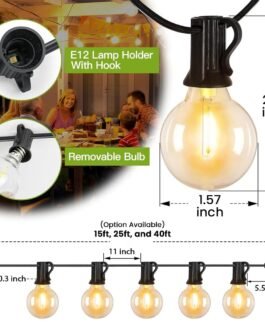 EASY INSTALLATION WITH BUILT-IN HANGING HOOKS: Set up your outdoor lighting quickly and effortlessly. Each bulb comes with a built-in hanging hook, allowing you to adjust the position of individual bulbs for perfect placement, The standard E12 socket allows for easy bulb replacement if needed. Connect up to 7 sets end-to-end, allowing you to extend your lighting setup for larger spaces or more coverage. Available in 15ft, 25ft, and 40ft lengths to suit various spaces, ensuring you can find the perfect fit for your outdoor areas.