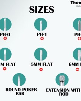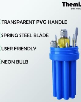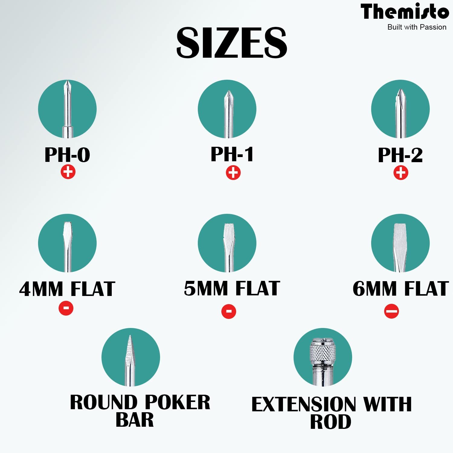 Themisto Screw Driver Kit contains 3 flat blades of 4mm, 5mm and 6mm, 3 Phillips heads of PH0, PH1 and PH2,an extension rod, and a round poker bar with a transparent PVC handle with LED light.