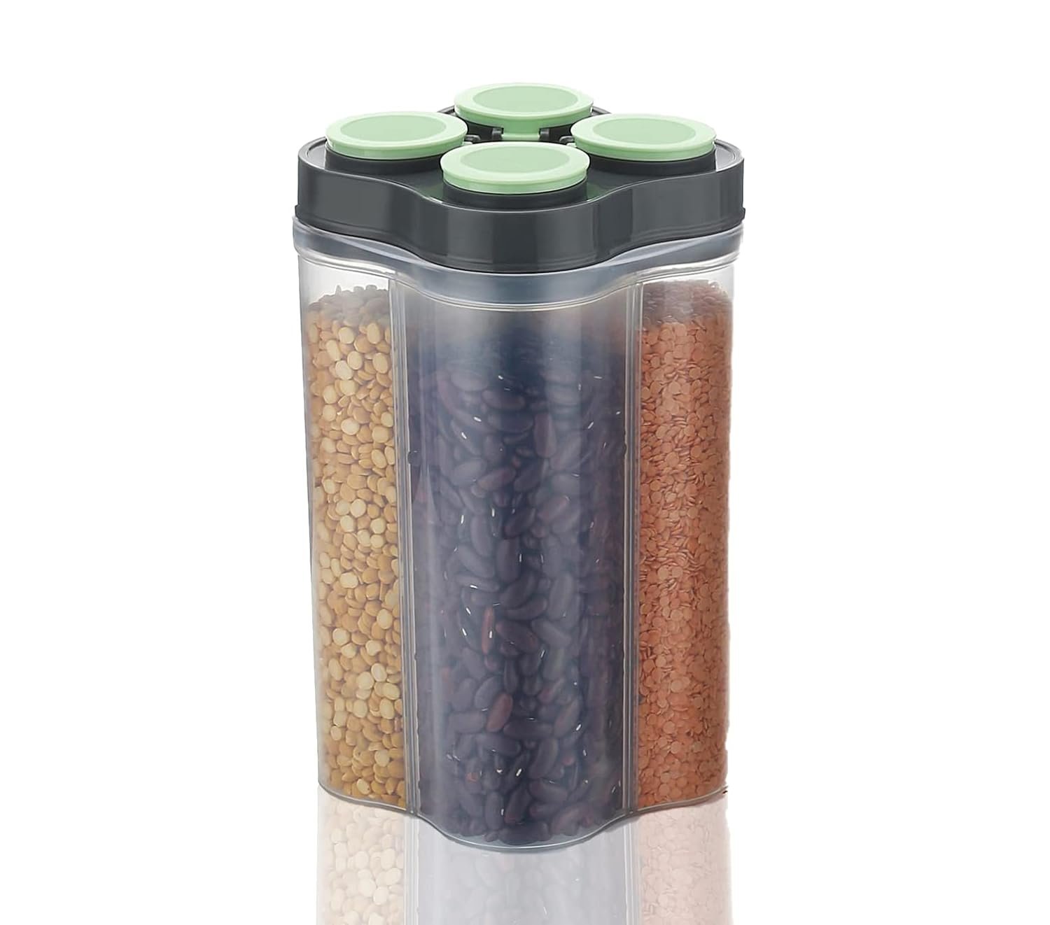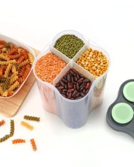 Airtight Transparent Plastic Lock Food Storage 4 Section Container Jar for Grocery, Fridge Container & Containers, Kitchen Storage Box & Container Set for Sugar, Coffee, Rice.4 Section container is made from 100% food-grade PP plastic which is BPA-free. This airtight container is designed to be odor-free, thus keeping the aroma and taste of your stored items intact. You can store a variety of foods ranging from cereals, spices, dry fruits, pulses to salt, sugar, snacks etc. in the jars. This 4 Section container have individual 4 sections in one container, so that you can store 4 different food items in one container without mixing one with each other.These food containers are the perfect way for you to store anything from cereal, flour snacks, and beans to coffee, sugar, tea – or anything else you’d like. Also, this container is a space saver for your kitchen cabinet. It can be used to store various food items as per your wish.