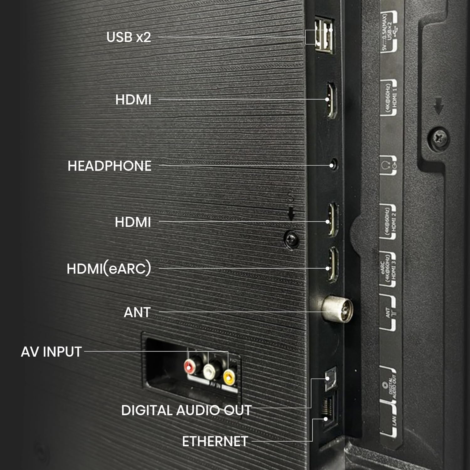 Connectivity: 2 HDMI ports to connect set top box, Blu-Ray players, gaming console | 2 USB ports to connect hard drives and other USB devices | 3.5mm to connect your headphones | Bluetooth
