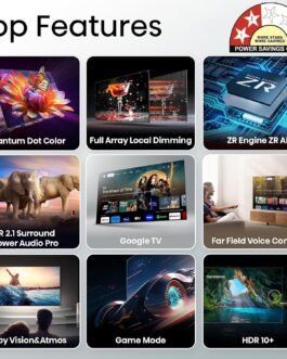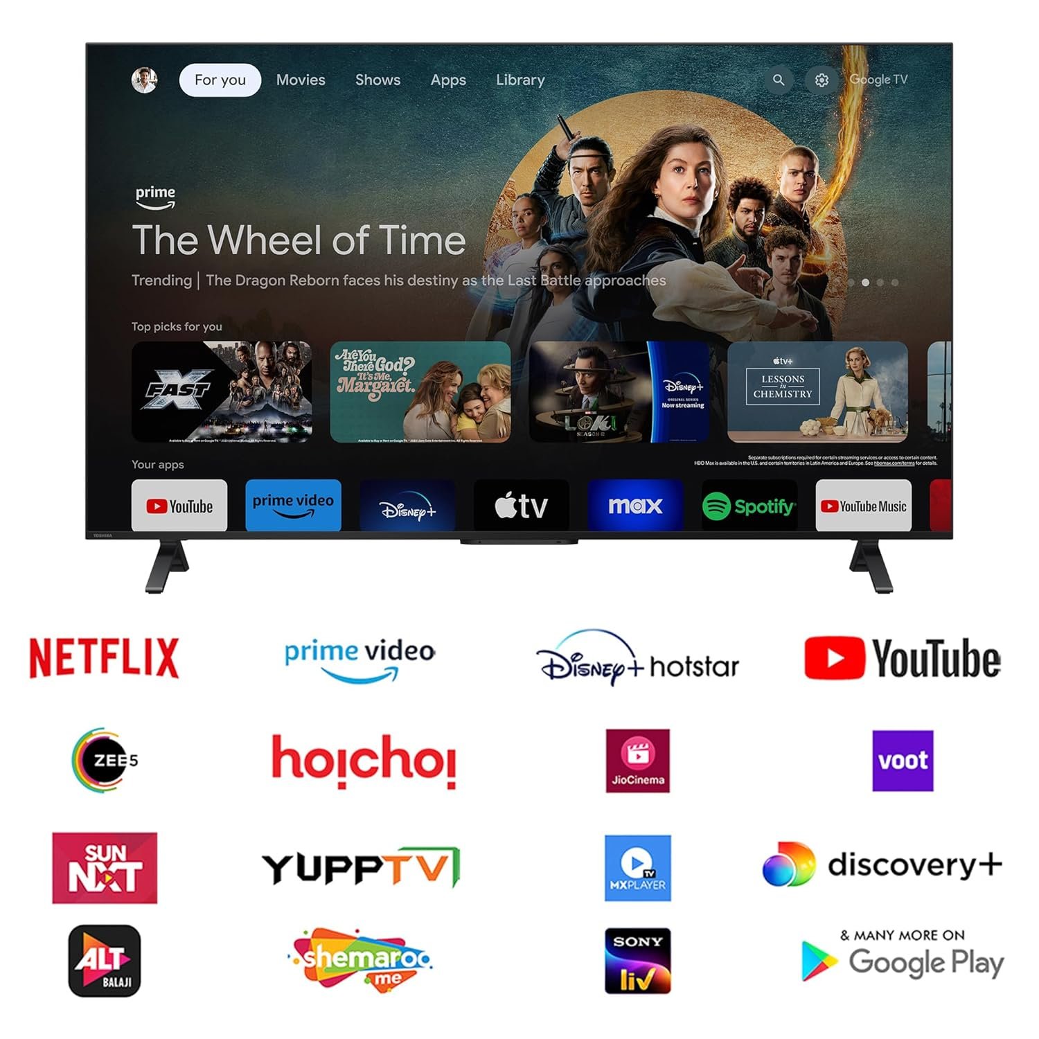 Smart TV features: Google TV | Google Watchlist | Google Assistant | Hands Free Voice Control | Screen Sharing (Chromecast, Miracast, DLNA, AirPlay) | REGZA Engine ZR Intelligence | Game Mode | Filmmaker Mode | Auto Low Latency | VRR | Supported Apps : Netflix, Youtube, Prime Video, Hotstar, SonyLiv, Hungama, JioCinema, Zee5, Eros Now