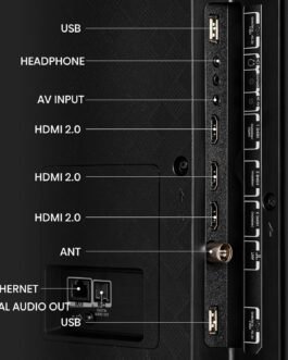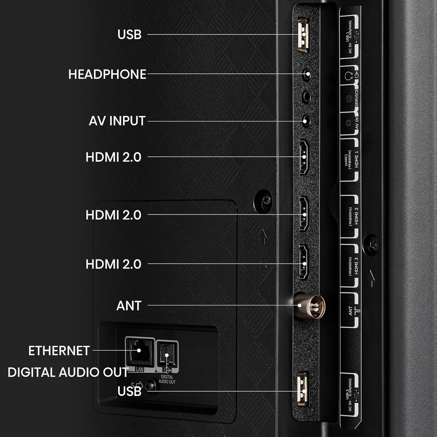 Connectivity: 3 HDMI 2.0 ports (eARC supported) to connect set top box | 2 USB 2.0 ports to connect hard drives and other USB devices | Dual-band Wi-Fi | Bluetooth 5.0 | 1 Optical digital audio output (SPDIF) | 1 Earphone jack | 1 Ethernet port (RJ45 connector) | 1 RF- Radio frequency input | 1 AV input