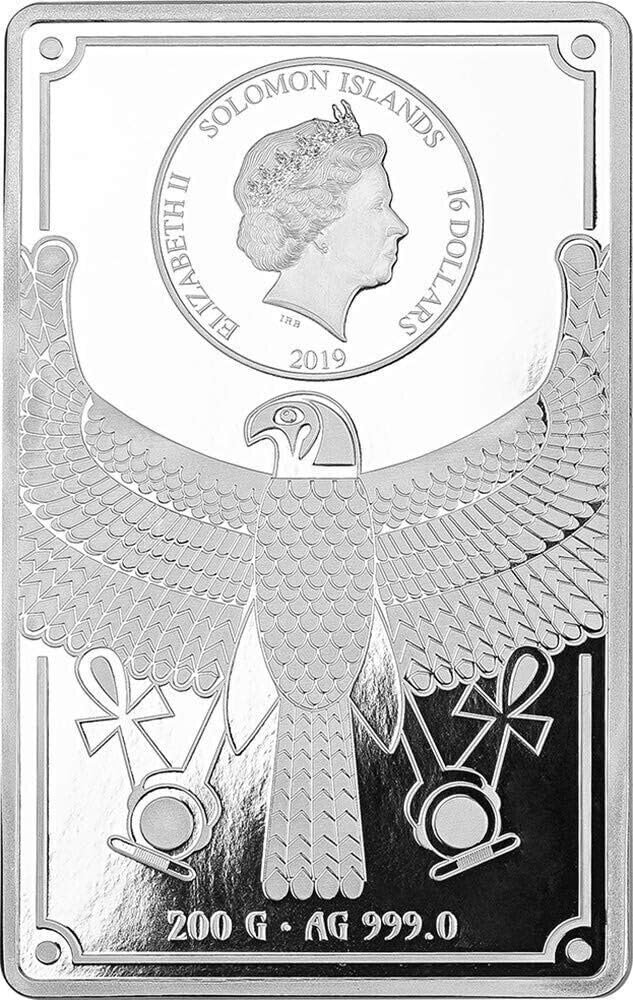 CLEOPATRA Masterpieces 200 Gram Silver 12 Gram Gold Coin Solomon Islands 2019 – This wonderful 200 Gram Silver coin is the first issue from the new “Masterpieces” series and features a second 12 Gram Gold coin inlayed in shape of a Scarab. The coin features 29 genuine gemstone inserts, has a selective Rhodium plating, has a wonderful colouration and comes in a luxury case, along with the Certificate of Authenticity. Limited mintage of 700 pieces worldwide. The reverse of these two coins compose a single masterpiece that features the figure of the beautiful Cleopatra, one of the most fascinating women of all time. A scarab made of lapis lazuli is placed in the middle of the gold coin. The obverse of both coins depicts the effigy of Her Majesty Queen Elizabeth II and the inscriptions: “ELIZABETH II” – the name of the Queen, “16 DOLLARS” – the face value of the Silver coin, “50 DOLLARS” – the face value of the Gold coin, “SOLOMON ISLANDS” – the issuing country and “2019” – the year of issue.