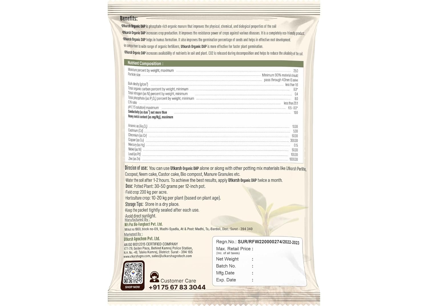 Direction of Use: You can use Otkarsh Organic DAP alone or along with other potting mix materials like Utkarsh Perlite, Vermiculite, Cocopeat, Neem Cake, Castor Cake, Bio Compost, and Manure Granules. Water the soil after 1 – 2 hours. To achieve best results, apply Utkarsh Organic DAP twice a month.