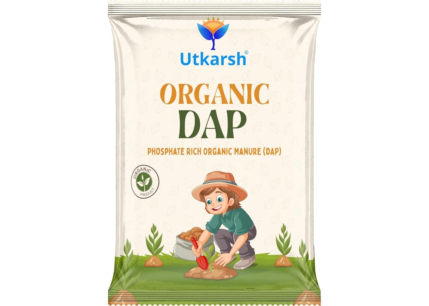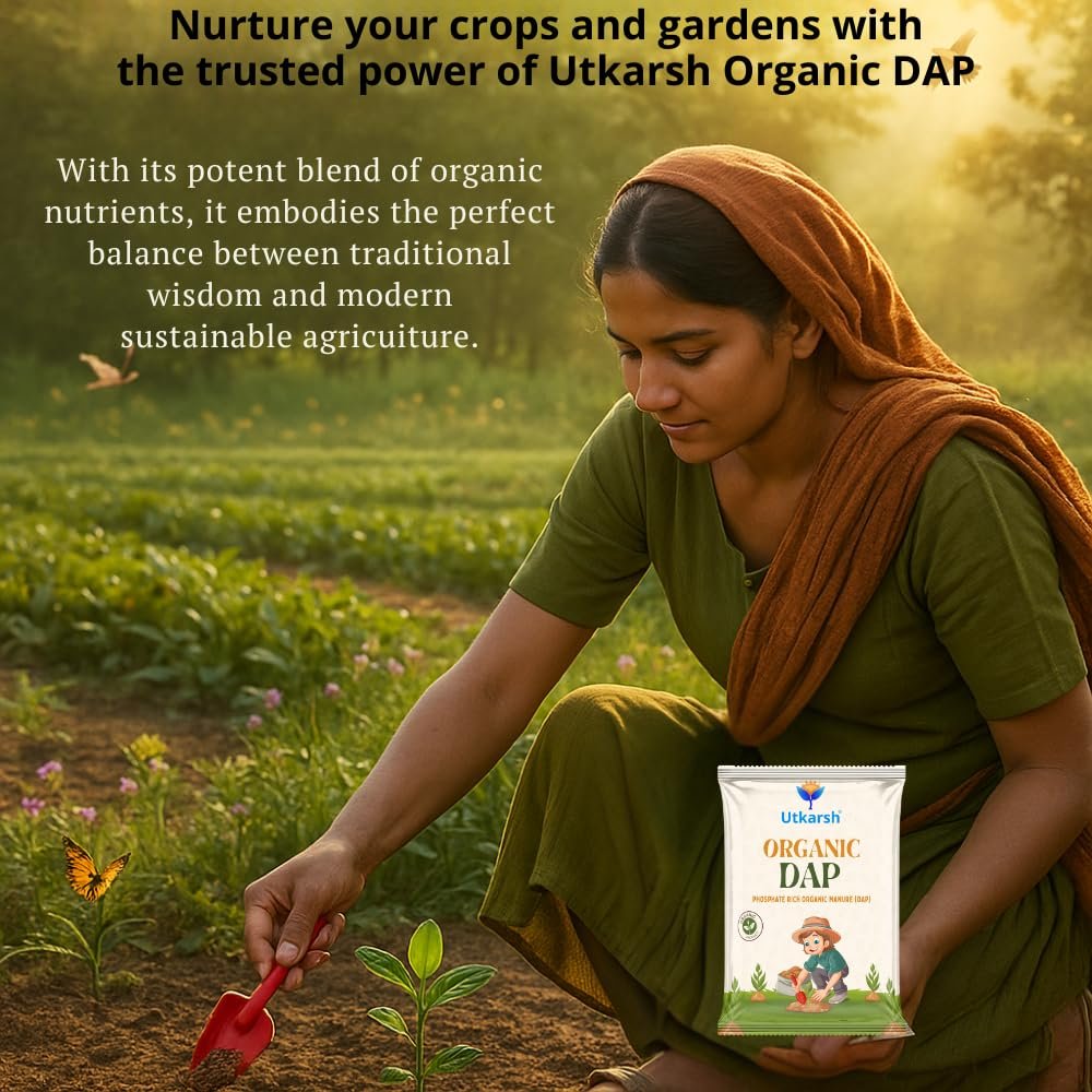 Utkarsh Organic DAP is a phosphate-rich organic manure that enhances the physical, chemical, and biological properties of the soil. Compared to many other organic fertilizers, it is more effective in promoting faster seed germination and early plant growth. This eco-friendly product aids in the formation of humus, improves seed germination rates, and supports strong root development. Utkarsh Organic DAP increases crop yields and boosts plants’ resistance to various diseases by enriching the soil with essential nutrients. It also releases CO₂ during decomposition, which helps lower soil alkalinity and improves nutrient availability. Suitable for a wide range of plants, it can be used on its own or mixed with other potting materials like Utkarsh Perlite, Vermiculite, Cocopeat, Neem Cake, Castor Cake, Bio Compost, and Manure Granules. For best results, apply it twice a month and water the soil 1–2 hours after application. The recommended dosage is 30–50 grams per 12-inch pot for potted plants, 200 kg per acre for field crops, and 10–20 kg per plant for horticulture, depending on plant age. Store in a dry place, keep the packet sealed after use, and avoid exposure to direct sunlight.